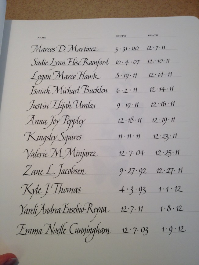 There is a chapel here at Children’s Hospital on your left as you enter the Giraffe entrance. There you will see a wall of windows facing west with four stained glass panels. Faux candles flicker in the window sill. A great tree sculpture fills the opposite wall. There are chairs and a pulpit for a service. This is where someone suggested I could come and cry, that it was a nice quiet place. That was the day I wrote about doing Allistaire’s dressing change and how so much held back, wild sorrow was straining to be released. I told her that this was not quiet crying I needed to do. Yet because of her suggestion, I checked out the chapel a few days later. It was late afternoon and bright yellow sun was breaking in under the low clouds, streaming out from the crack in the cloud in a wide plane of light that lit up the room with sudden honey warmth. I walked about the room seeing all that it contained. I was drawn to a little alcove in the wall where two enormous black books lay. I expected to find a huge Bible. Instead, I took in one of the most sobering sights I have ever seen. Even to begin contemplating what I was seeing was daunting beyond words. I knew that if it felt this weighty just to look through the pages, that I could not begin to truly imagine what each line written actually represented – a life, a beginning and an end. On each line, in beautiful black script is written the full name of a child with their date of birth, and then, the simple numbers that tell you when the end came. Your eyes scan the dates and calculate, how old was this child? Some only a day old, some a month, another 5 years. You read the name, the carefully selected name, the name that was to be written in a first graders thick pencilled letters, the name that was to appear in embossed letters on a diploma or wedding invitation, a name that would be the first impression on a resume. On that day the last dates written in the memorial book were several months ago. Today when I was in the chapel the last life ended but 6 days ago. She was 8 months old.