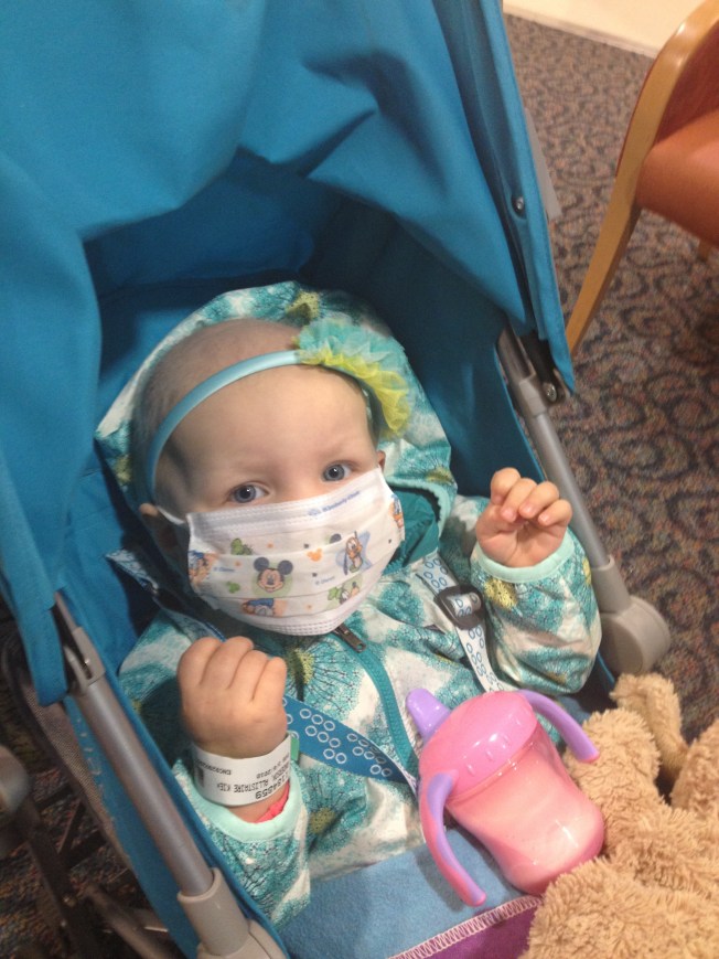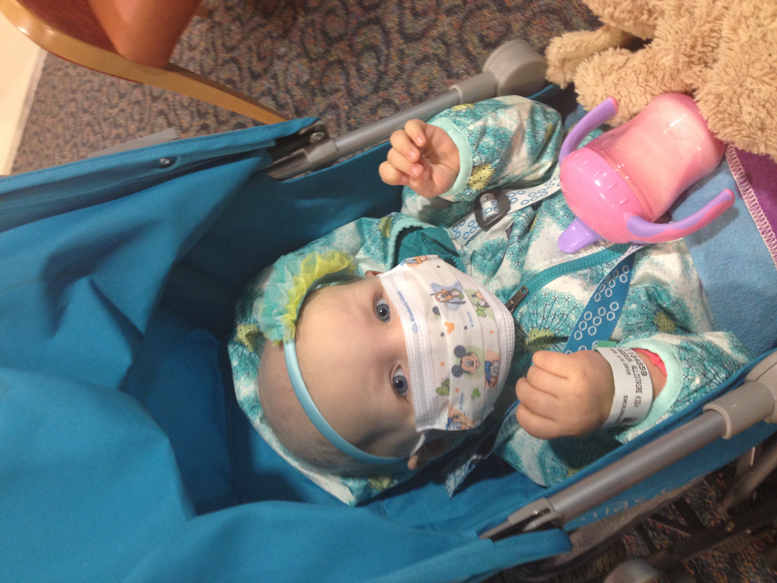 Today went well. Allistaire got labs drawn and then we went for her dressing change, which thanks to the magic spinning light toy the Child Life Specialist gave us, Allistaire did not cry for even one moment and now we have a lovely fresh new dressing to take us through until next Monday. Then we were off to our clinic visit. This is where things slowed down – way down. We sat in a windowless room with one unfortunate orange wall for an hour waiting for the doctor. Finally, at 3:15 (2 hours past nap time) the doctor came in and examined Allistaire. She said she looks great and her lungs sound great. She does appear to have a bit of fluid backed up in her ears due to being a little stuffed up but no ear infection so far. Please do pray about this. Last spring, Allistaire had ear infection after ear infection which meant lots of rounds of antibiotics. We were scheduled for a transfusion of platelets at 4pm because her platelet level had dropped to 8 (they transfuse once you hit 10), so we mad a quick dash to pick up some food for my lunch and returned for platelets – back in the same ugly room. Because Allistaire has a cold, she is in isolation. So then we sat in for the next 2 hours while Allistaire got her platelets. Apparently I was quite a bit off in my estimation of how long this would take. Allistaire was so very tired and very cranky but I had her strapped in her stroller waiting for her eyes to close. At last, after fighting it for way too long, Allistaire fell asleep a little after 5pm. When we are finished up the nurse was a bit concerned because Allistaire’s heart rate was up (156) and her temperature was 37.4. This is the temp where they start checking it every 30 minutes. Praise the Lord, when we got home I checked her temperature right away and it was 36.9. The rest of the evening Allistaire’s cheeks felt cool to the touch. I was so prepped in my mind to have to just turn around and head back to the hospital and begin another stay. I thank the Lord for one more night at home.