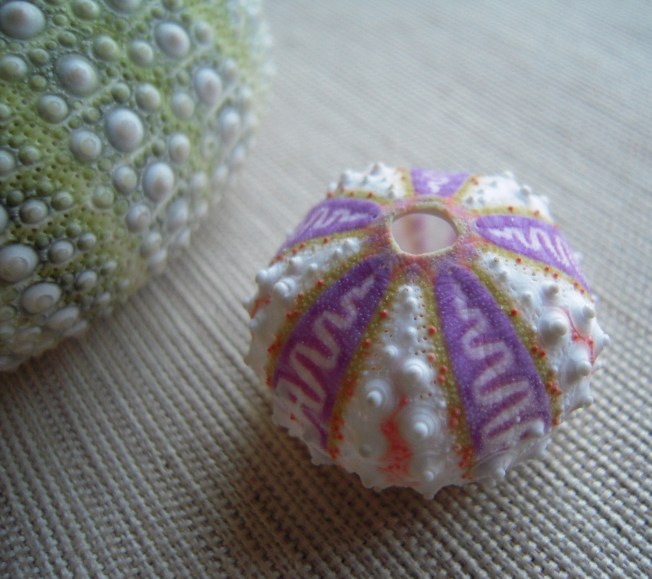 I paid $12 for two sea urchins at the antique store yesterday. They were $6 each. I suppose they would fit more into the category of, “curiosities,” rather than antiques. They sat in a great glass cabinet with scores of other treasures from the sea. My fight is not against cancer, it is a battle to submit my heart over and over to the One True God and accept what comes from His hands. The doctors and pathologists examine Allistaire and bits of her flesh and determine what medicine she needs. They strategize the best method of getting the agents of war into her at just the right moments and with the most effective means. And Allistaire is so young; she only knows to scowl and resist yet one more squeezing of her leg to determine her blood pressure. The war of what it all means is left largely with me; a bulkiness that I attempt to carry and am unable to get away from. Even before I could feel the urchins in my hand, through the glass cabinet door my eyes took in the lovely green color of moss and the intricate, flashy design of purples and orange, like some vintage ’80s sweater. Once in my hand, the tips of my fingers detected the spires in precise array. I held the smaller of the two up to the window. Tiny streams of light passed through perfectly placed holes; symmetry like flower petals. As I walked through University Village yesterday, I stopped abruptly at the sight of the most delicate, feathery leaves of a Japanese Maple; their bright paper-thin green layering shade upon shade of green as they overlapped one another and the sun shone down over them. Here are the tools of my fight. Here are the weapons of my war. These innocent wonders silently, blaring their declaration that there is a God. That life is not random. That there is beauty and intention and outlandish, absurd luxury. In some random hallway, we walked today to fill the time until Allistaire’s bone marrow test. There on the wall was one of my most favorite things in the world. A poster, entitled, “Biochemical pathways.” I’ve only seen it two other times. I don’t claim to understand a thing about it, but it is simply it’s daunting complexity and detail that thrills me to the core. I am reminded of the poster on the wall of my classroom, the one year I taught junior high and high school science. It is a poster showing the electromagnetic spectrum with the wide stretched-out radio waves on the far left. In the middle are the waves we can see with our eyes, showing up in violets and yellow, green, red and blue. The waves constrict and tighten, becoming ultraviolet and eventually gamma rays. My mind is off, soaring over one delight and wonder after another – the octet rule in chemistry where every atom is ever on the hunt to rid itself or obtain electrons that it might be at rest with eight, the fact that there would be no life on the planet if it we not for the fact that the water molecule is bent rather than linear, making it polar. I recall the sight of the flashing bright, yellow just below the waves in Hawaii and know that I have seen those fish up close. I consider the looming, bulk of Mt. Rainier and it’s silhouette so known and loved from my childhood. How many stories can I tell you of the adorable things Allistaire has said or the thousands of times I have taken delight in the expression on her face or the intonation of her voice. Sometimes I just stop and look at her legs, at their sumptuous curves and the mystery that they continue to grow as bone cell adds to bone cell and skin cell and muscle accommodate the new dimensions. I wonder, how is it really, that such a thing began inside me? How did two mere cells create this being made not only of wondrous flesh but delight and joy and humor and angst and fire?