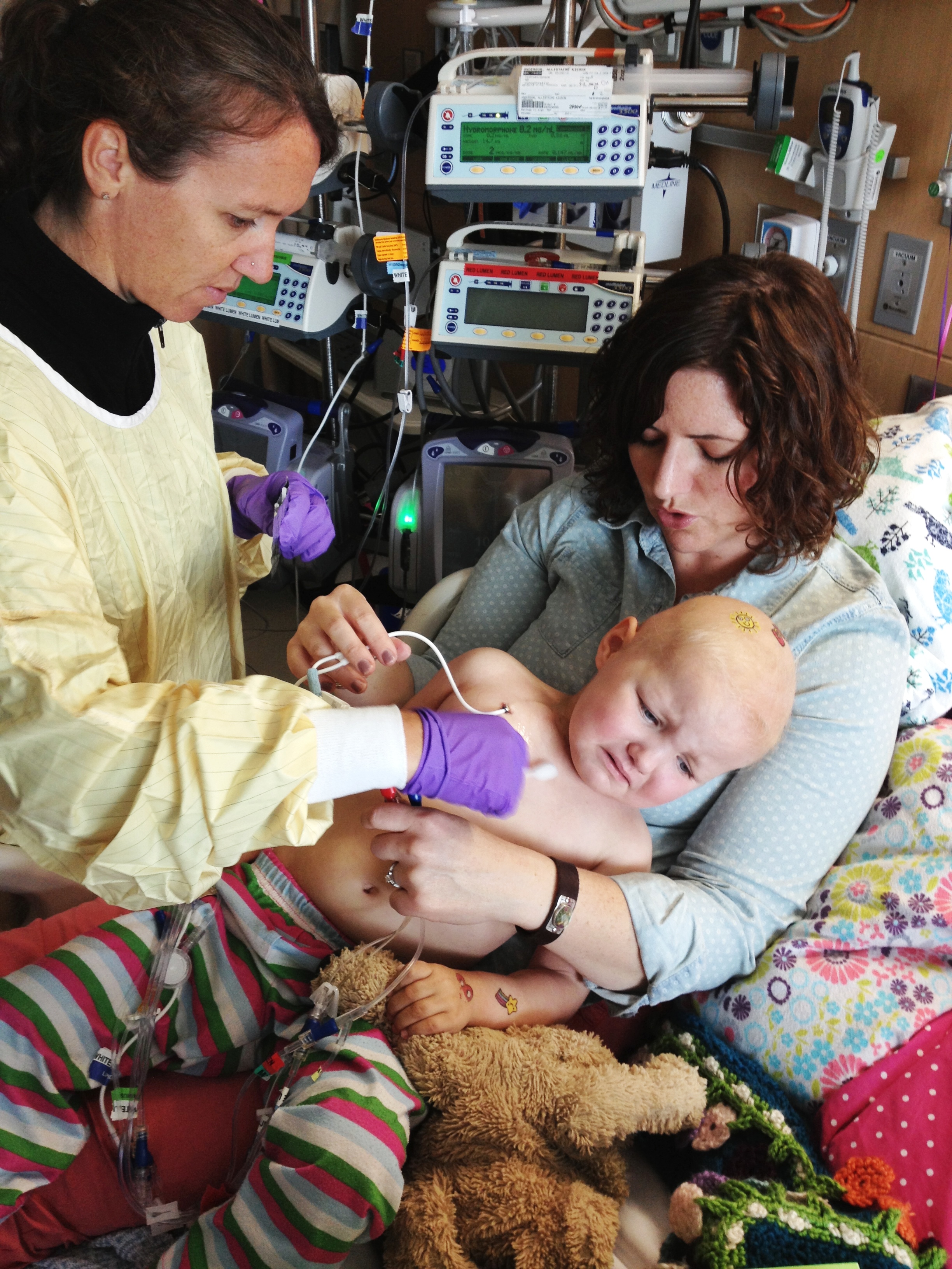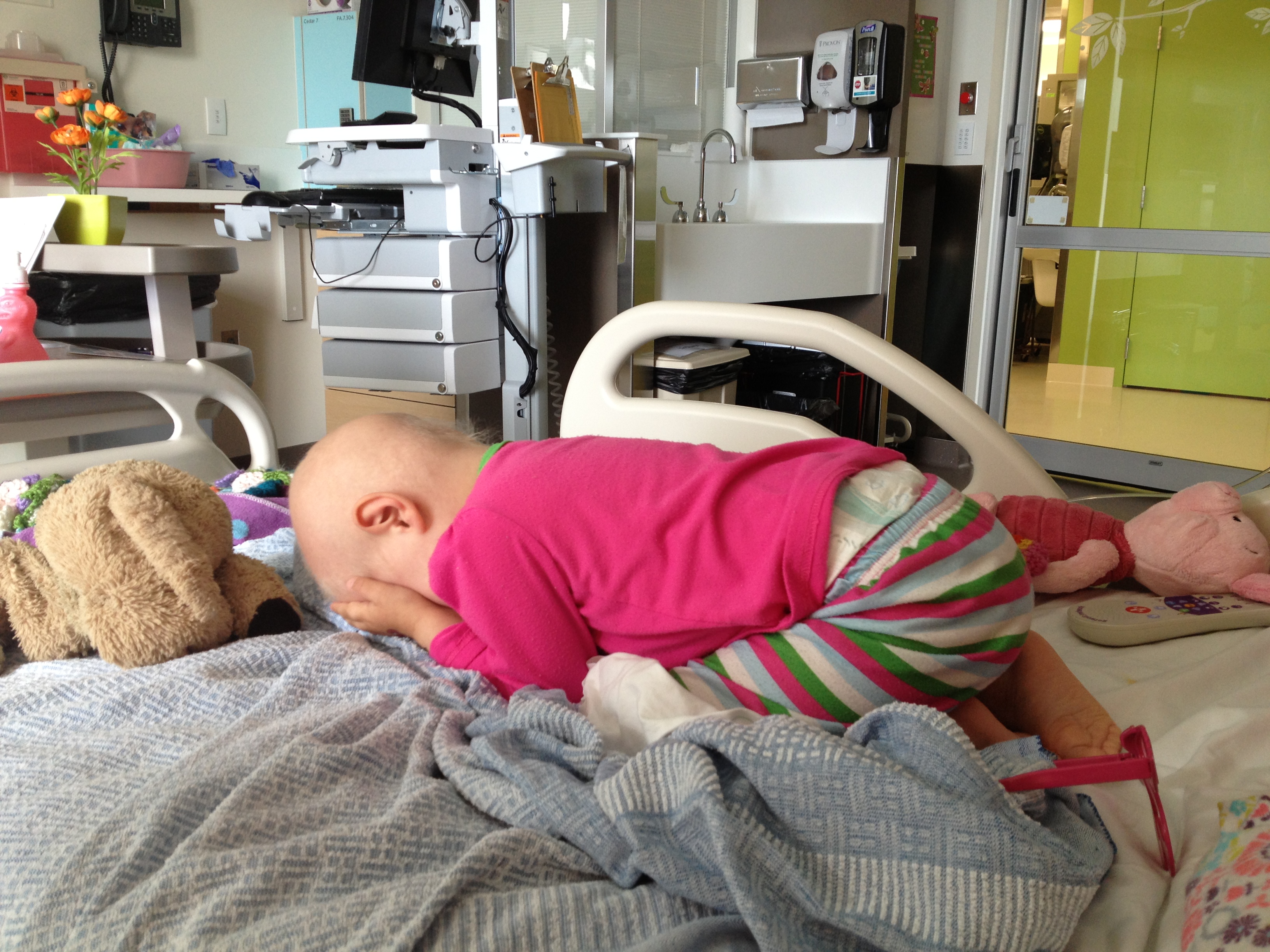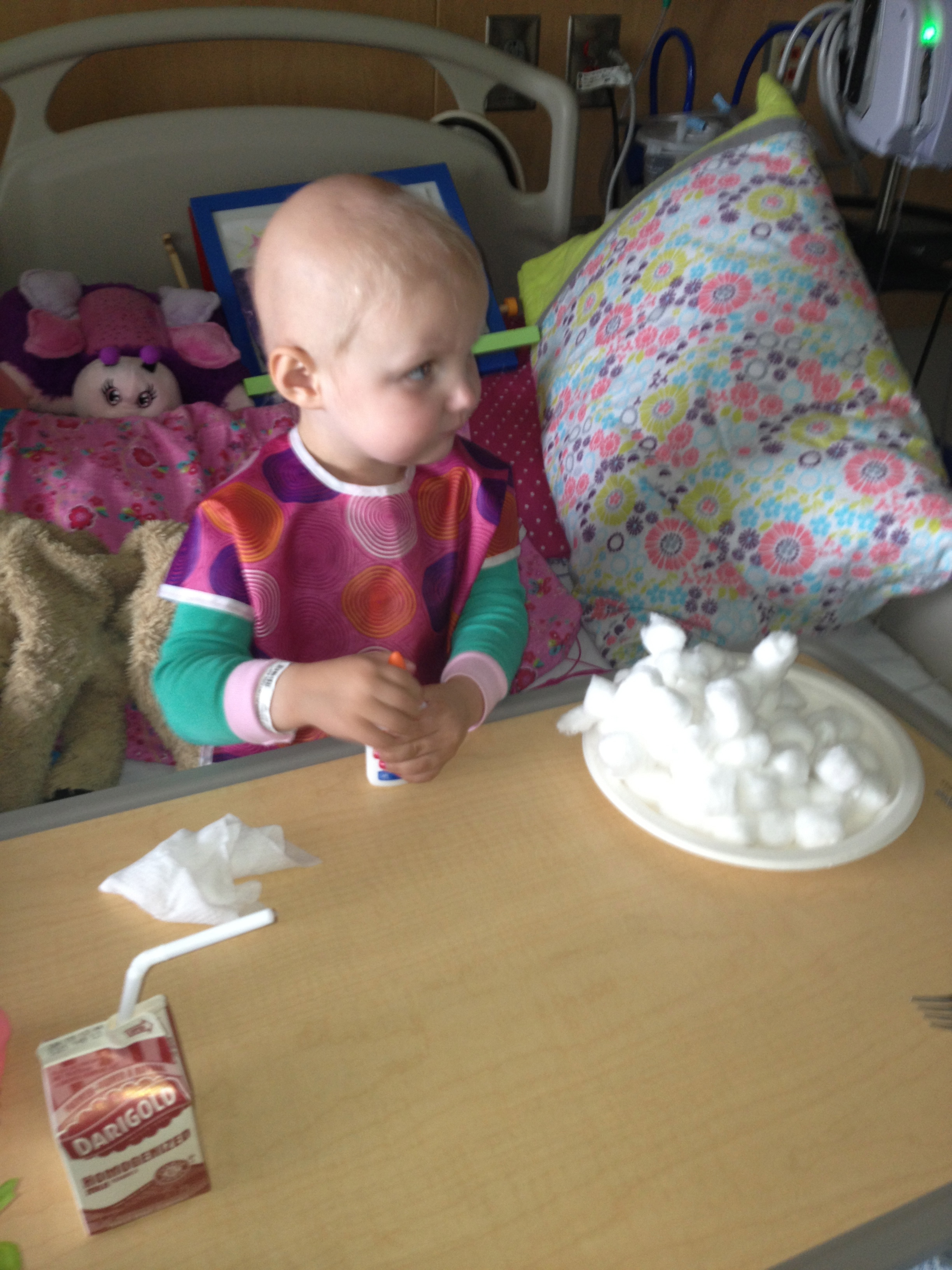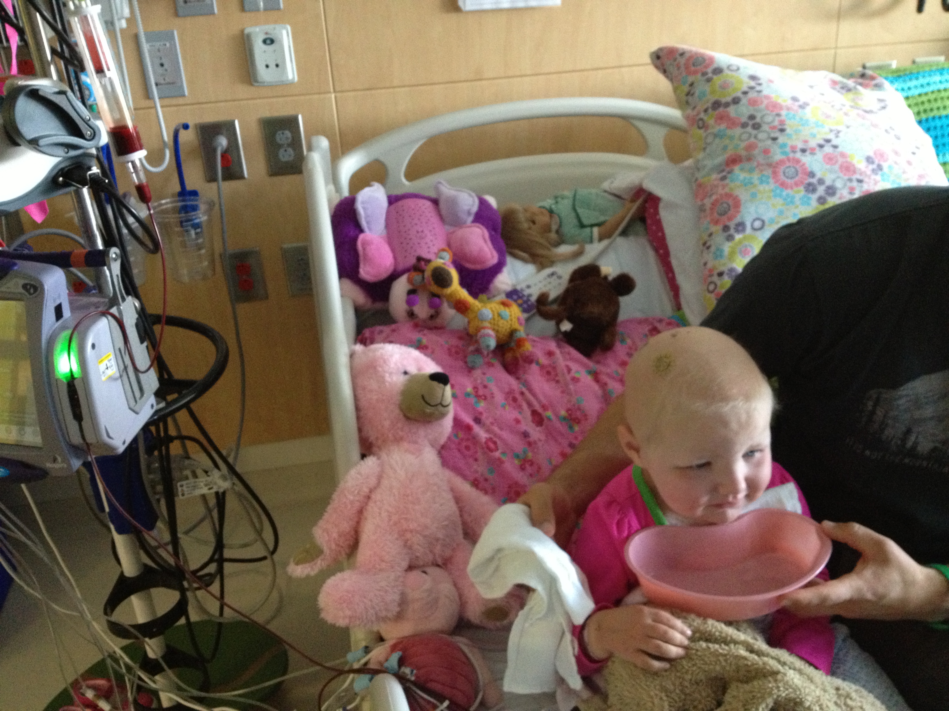 While I have been alone in a place meant for more, Allistaire has been having a rough time. Her Diladid pain-med drip has continued to increase and is now 6 times higher than the original dose. Thankfully this seems to have finally met her pain level and she is overall more comfortable as far as pain goes. However, she does now have mucositis in both her tummy and her throat and mouth. She keeps this little crescent shaped mauve bowl nearby to spit up mucus. She uses a small cloth like a burp rag to wipe her chin from the constant strange drool. In addition, she has been retaining fluid which is another common challenge at this point in transplant and is likely the capillary leak caused by the Clofarabine and/or the mucositis itself. Allistaire’s weight is typically right around 15 kg but jumped up to 16.5 kg. This is not because of a calorie increase. She has not put almost any food or drink in her mouth in over a week. She is being supplemented with IV nutrition and lipids. This means the additional weight is fluid retention. Her little eyelids are puffy and her cheeks are huge. So they give her Lasix which is a diuretic. She pees like crazy and can lose a kilogram in short order. Because she is continuing to need blood transfusions (yesterday she got both blood and platelets), they always “chase” the transfusions with Lasix because of the fluid increase resulting from additional blood in her system. This fluid retention, along with side-effects from some of her meds, is another factor in her high blood pressure. Because she is unable to take any meds by mouth at this point, they switched out her by-mouth Enalapril, for a higher dose of the Hydralazine. The BMT doctors consulted with the Nephrology (Kidney) doctors who said that they could definitely increase the dose of Hydralazine from where it had been and this should better control her blood pressures, which it seems to be doing.