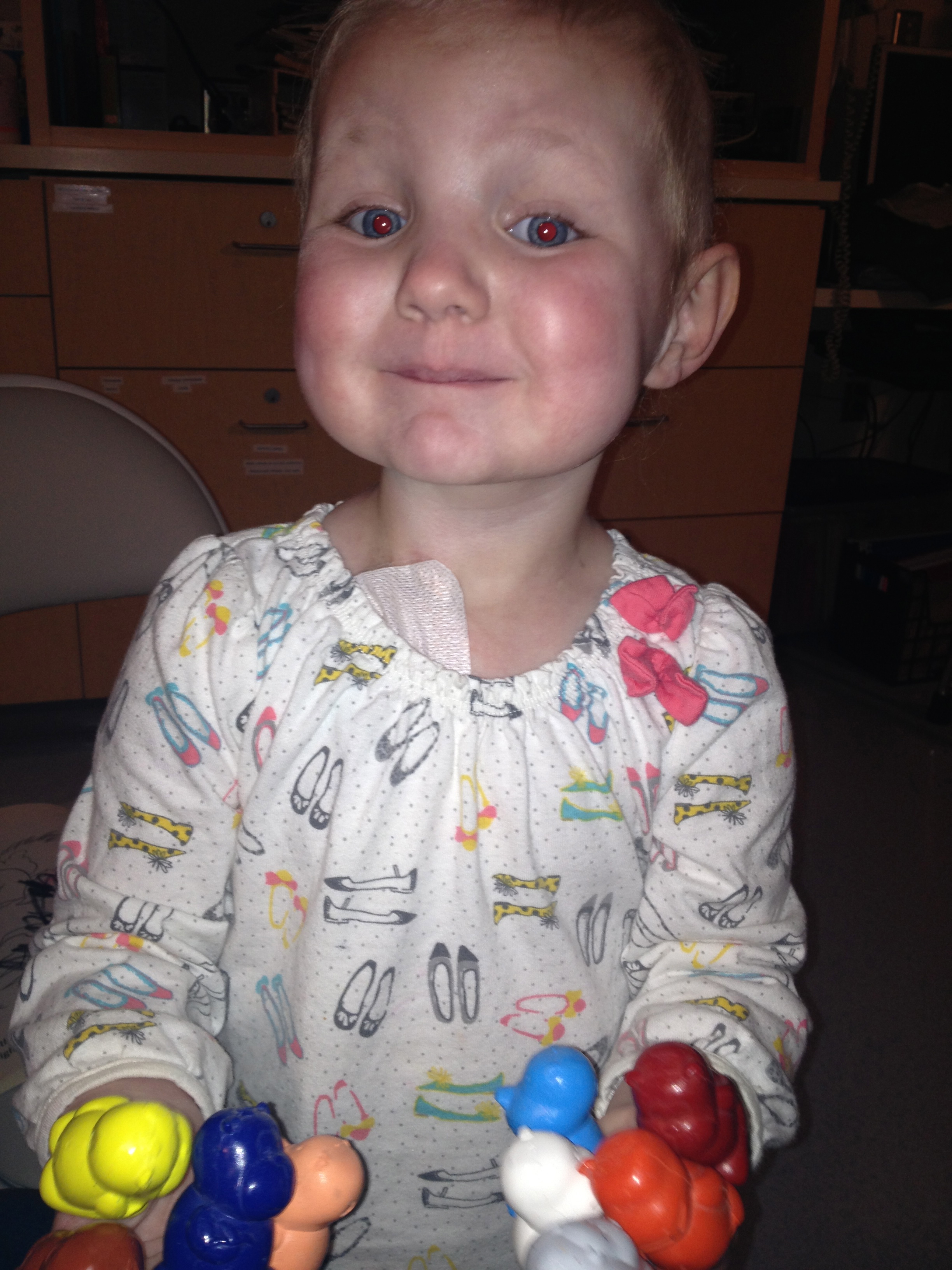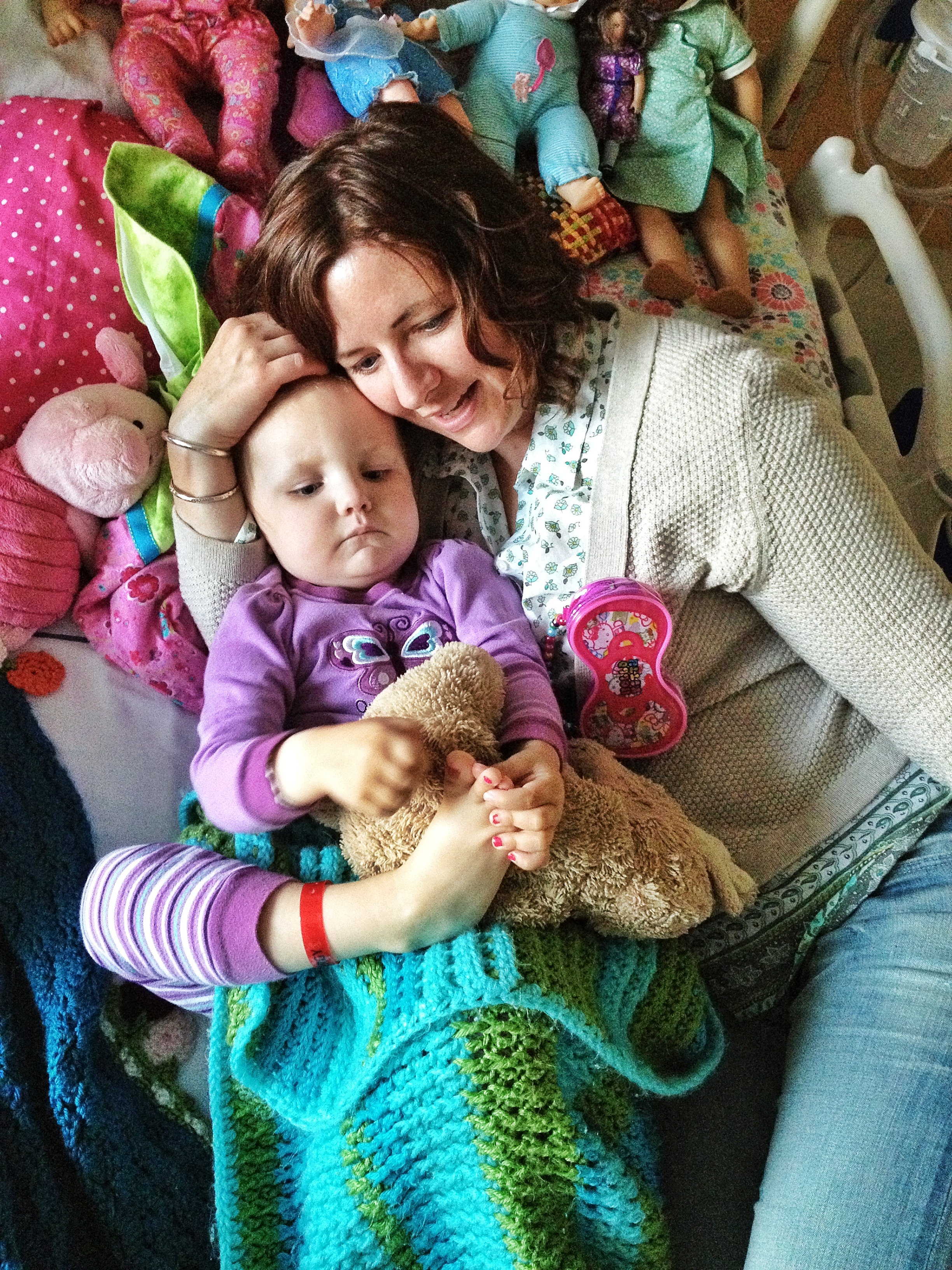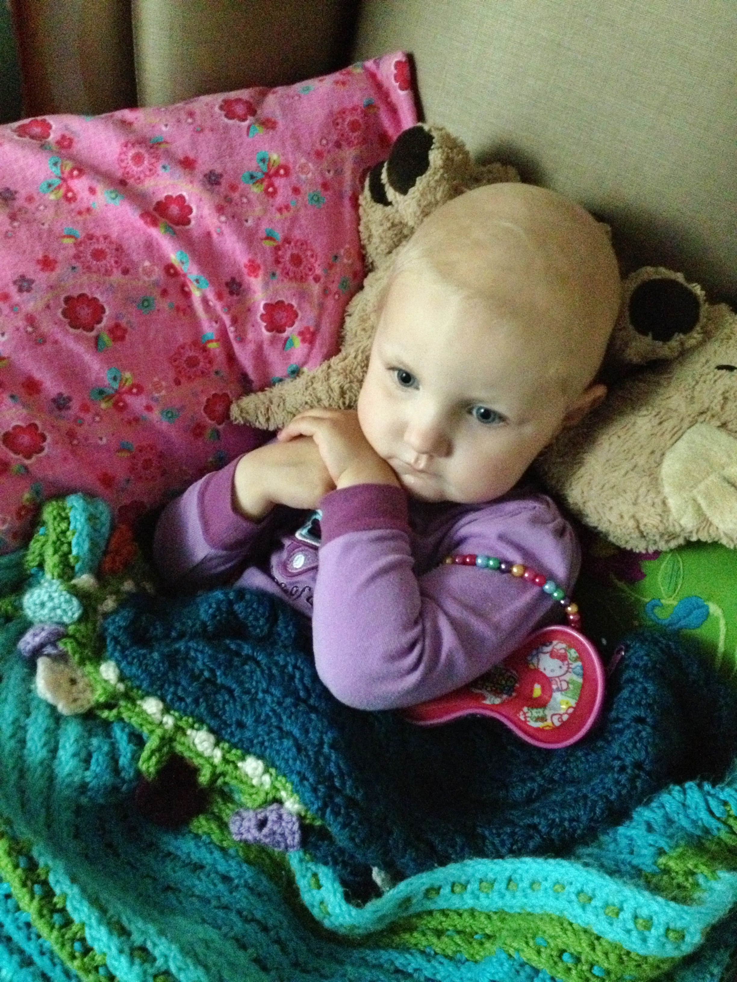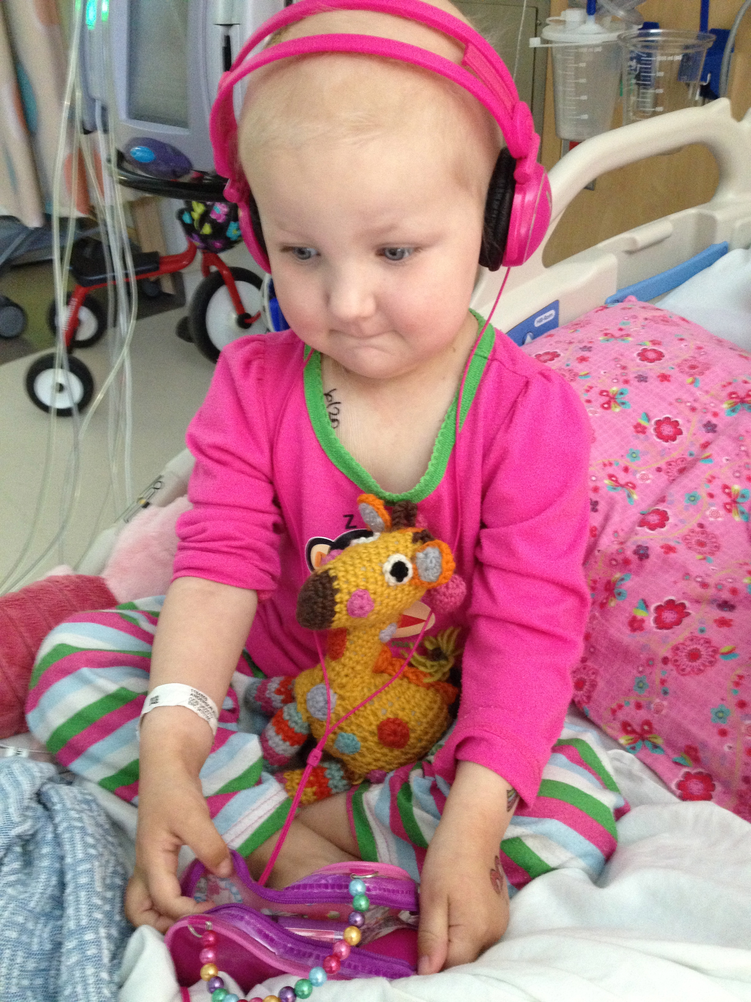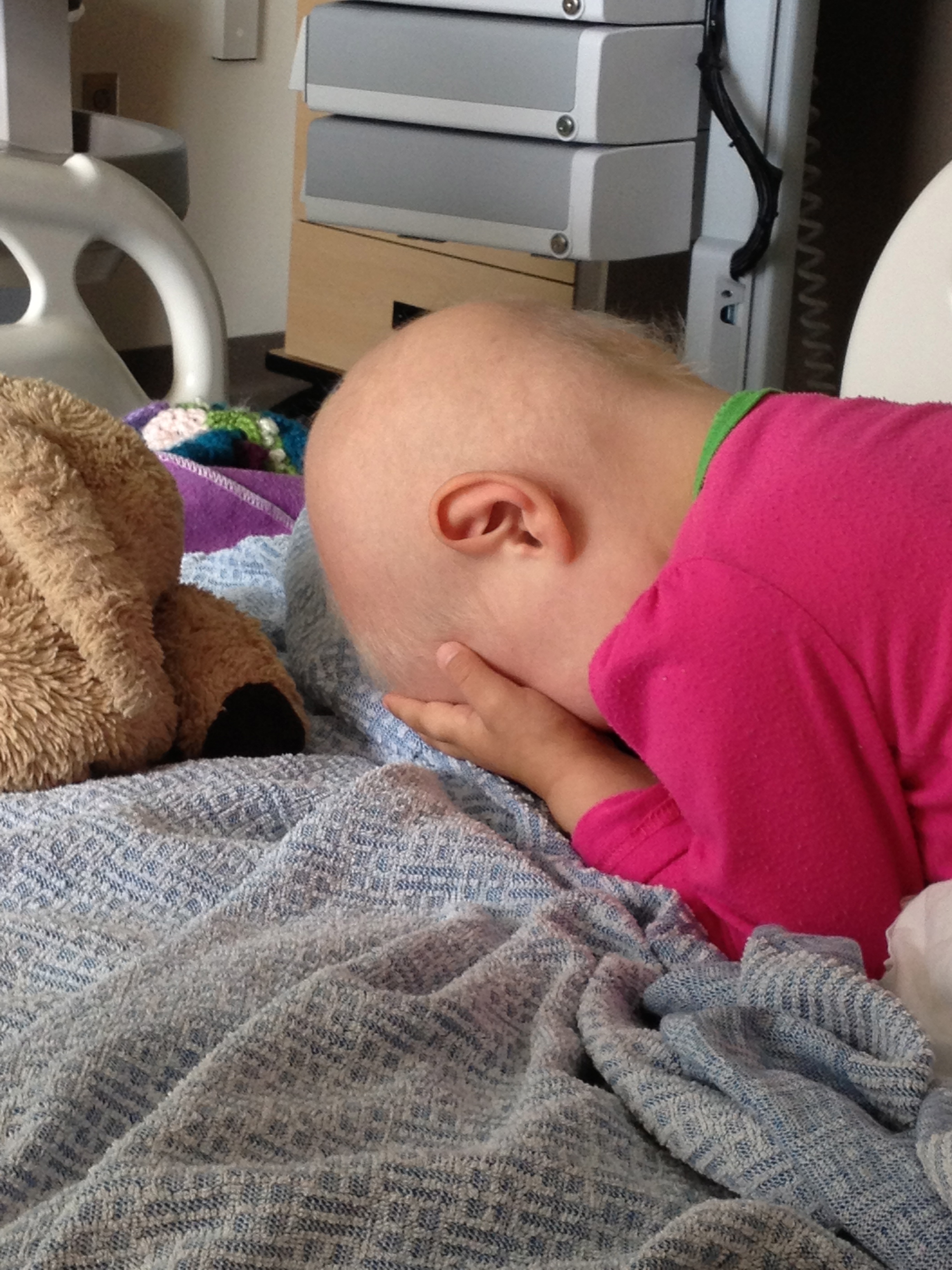 While I have been alone in a place meant for more, Allistaire has been having a rough time. Her Diladid pain-med drip has continued to increase and is now 6 times higher than the original dose. Thankfully this seems to have finally met her pain level and she is overall more comfortable as far as pain goes. However, she does now have mucositis in both her tummy and her throat and mouth. She keeps this little crescent shaped mauve bowl nearby to spit up mucus. She uses a small cloth like a burp rag to wipe her chin from the constant strange drool. In addition, she has been retaining fluid which is another common challenge at this point in transplant and is likely the capillary leak caused by the Clofarabine and/or the mucositis itself. Allistaire’s weight is typically right around 15 kg but jumped up to 16.5 kg. This is not because of a calorie increase. She has not put almost any food or drink in her mouth in over a week. She is being supplemented with IV nutrition and lipids. This means the additional weight is fluid retention. Her little eyelids are puffy and her cheeks are huge. So they give her Lasix which is a diuretic. She pees like crazy and can lose a kilogram in short order. Because she is continuing to need blood transfusions (yesterday she got both blood and platelets), they always “chase” the transfusions with Lasix because of the fluid increase resulting from additional blood in her system. This fluid retention, along with side-effects from some of her meds, is another factor in her high blood pressure. Because she is unable to take any meds by mouth at this point, they switched out her by-mouth Enalapril, for a higher dose of the Hydralazine. The BMT doctors consulted with the Nephrology (Kidney) doctors who said that they could definitely increase the dose of Hydralazine from where it had been and this should better control her blood pressures, which it seems to be doing.