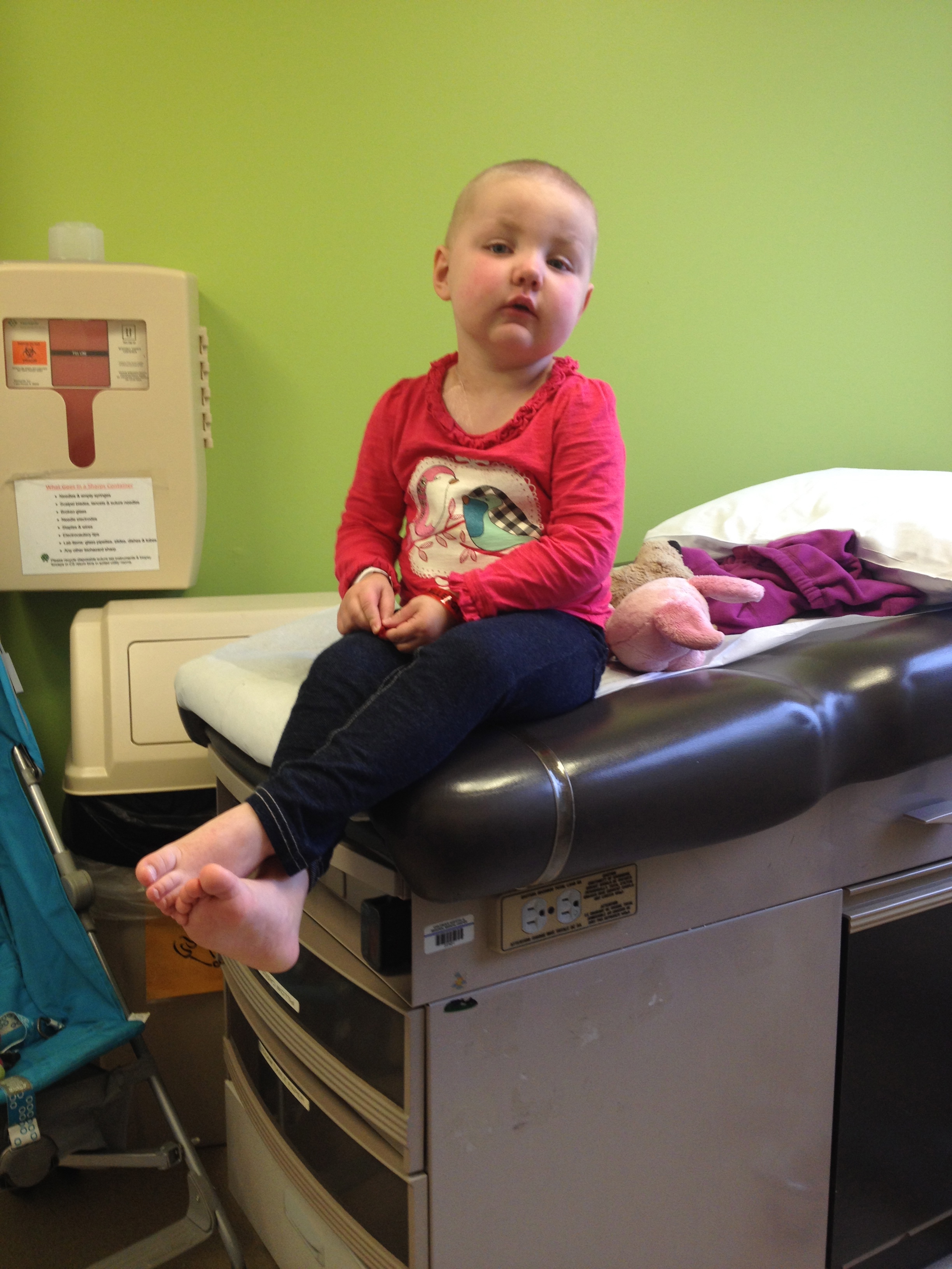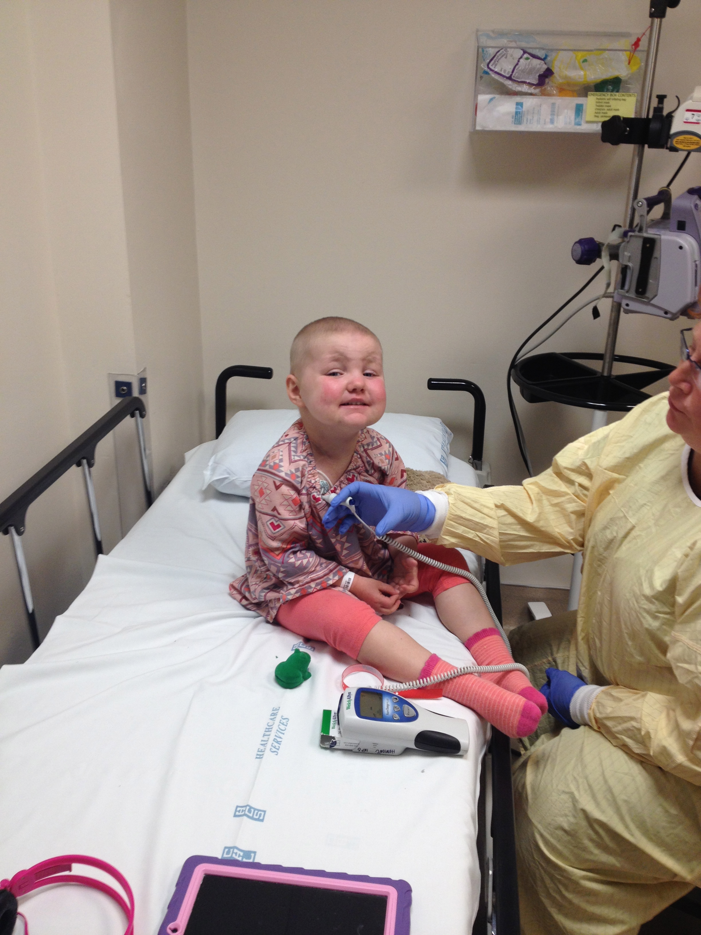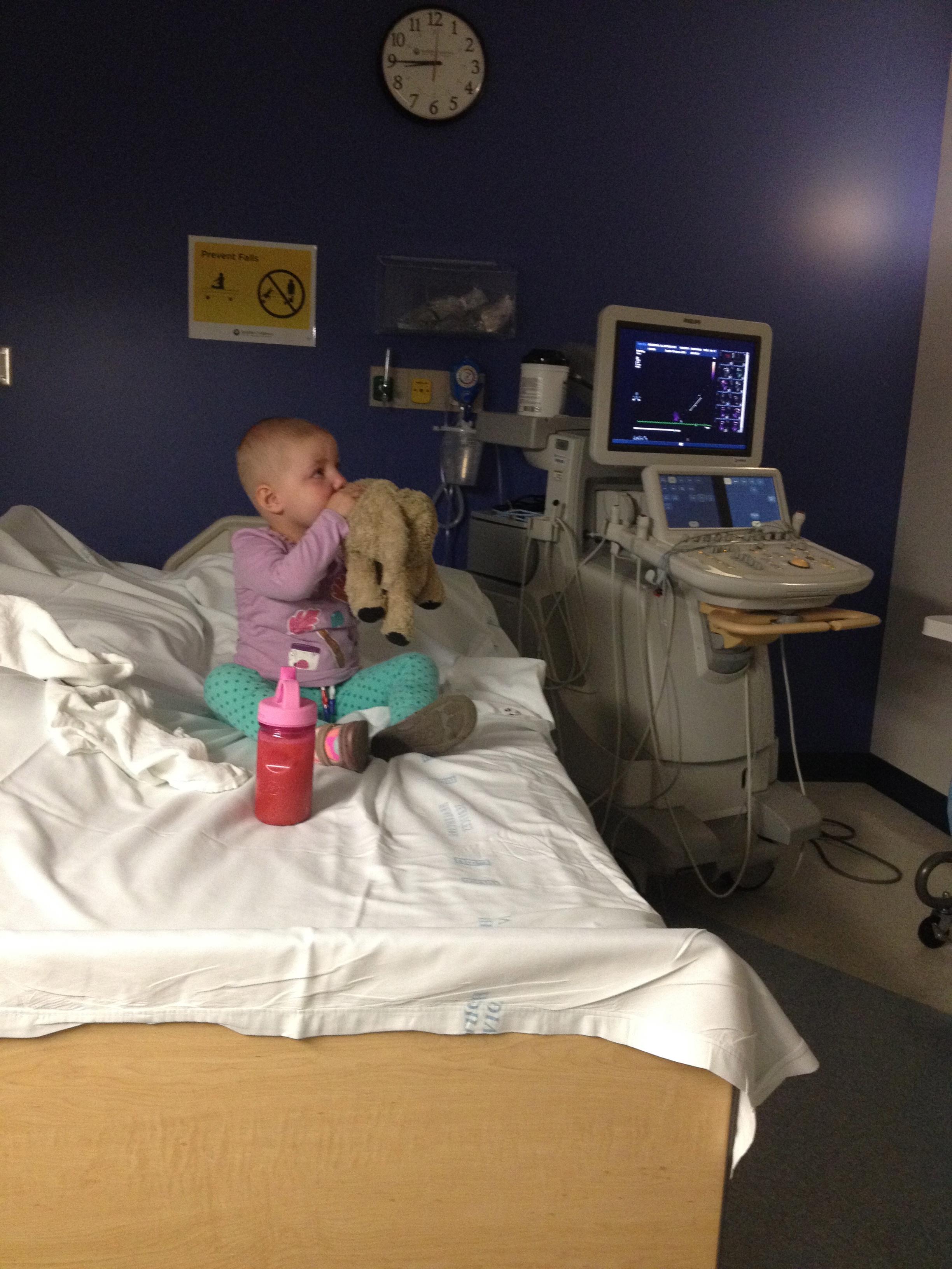 The two looming issues this week has been her heart function and the much-anticipated chimerism tests. On Tuesday morning, she had a surveillance echocardiogram which showed a drop in her heart function since the last echo in September for the Day + 80 workup. There was a drop in her Ejection Fraction from 53 to 50 (55 being the low-end of normal and a drop in her Shortening Fraction from 31 (her base-line before diagnosis) to 25 (28 being the low-end of normal). Our savvy Dr. Gardner, got us into the cardiologist the next day. Apparently it usually takes two months to get in on the schedule. We saw cardiologist, Dr. Sebrina Law who took copious notes. In summary, she feels that Allistaire has very mild chemotherapy induced cardio myopathy. Her EKG, which measures the electrical components of her heart, was perfectly normal. Additionally, her heart is not dilated, nor does she have any symptoms of decreased heart function: lack of appetite, lack of energy, shortness of breath. Because there is no dilation nor symptoms, she chose only to increase her enalapril dose to the maximum of what her weight allows, which only bumped it up an additional .5 ml twice a day. She said they will just follow her and want to see her again in three months, though I’m guessing, Dr. Pollard will want her in much sooner than that, as it is typical to get echos done after each round of chemo. I was very thankful that her heart issues are mild and have the possibility of being reversible.