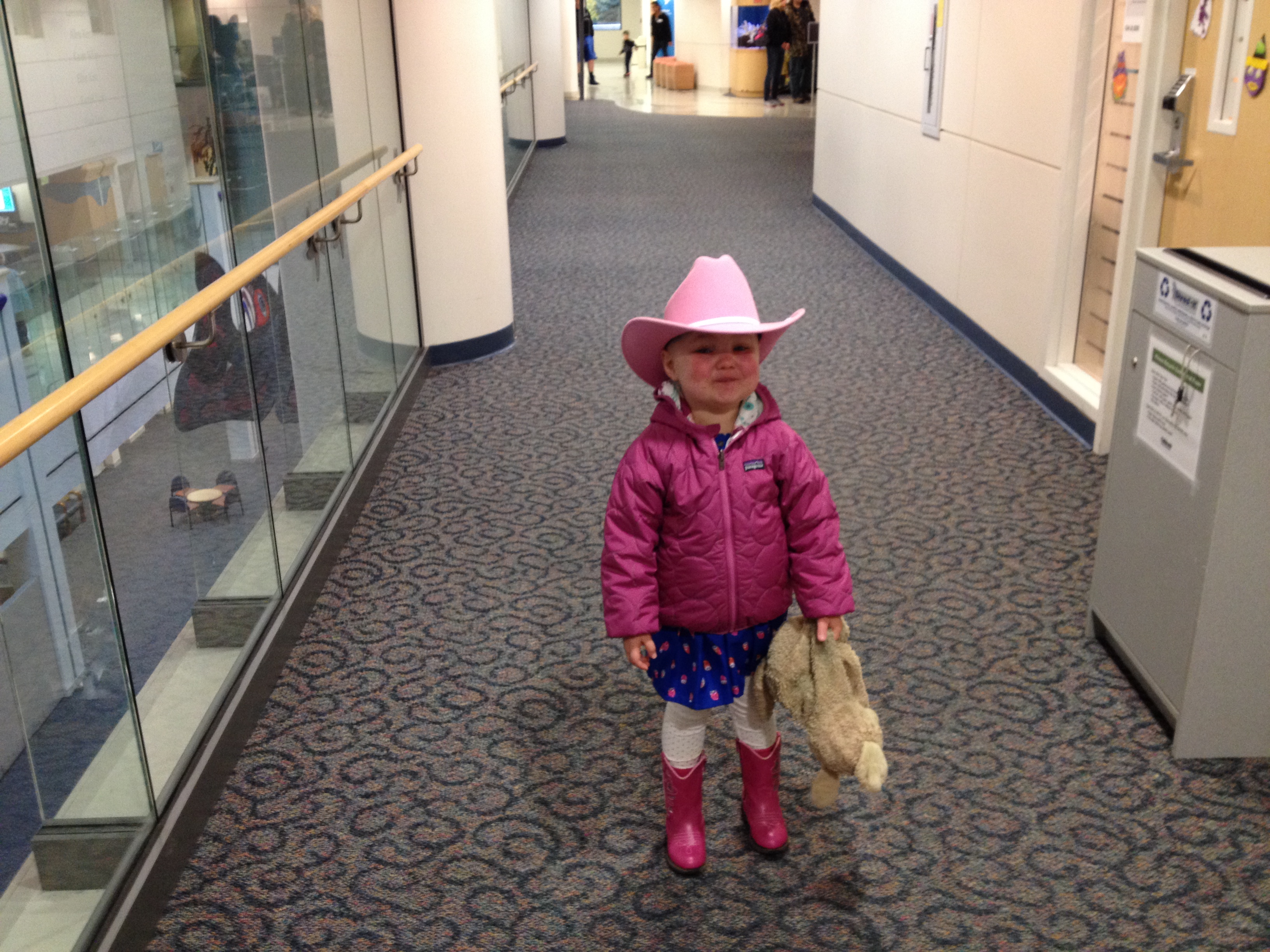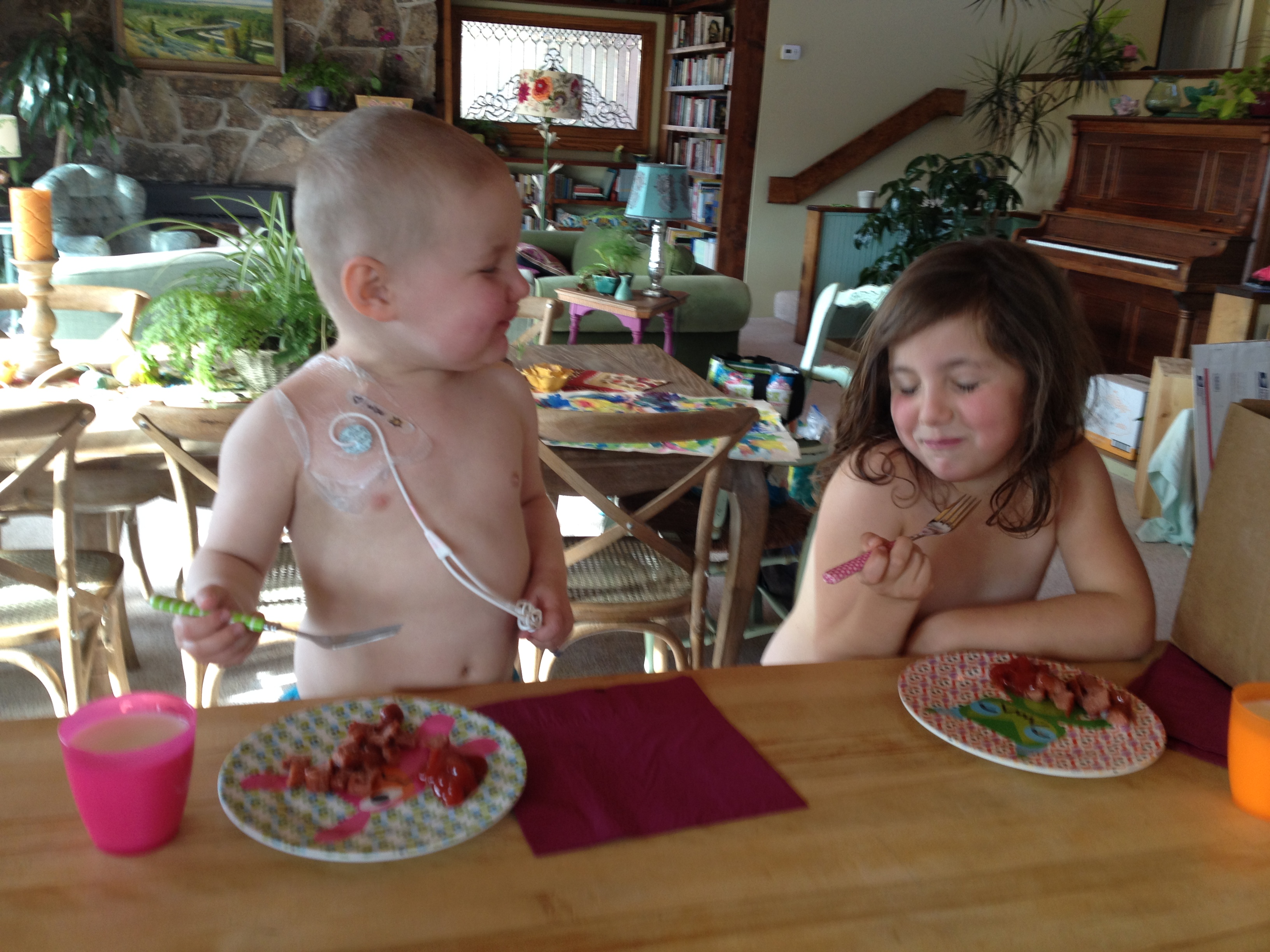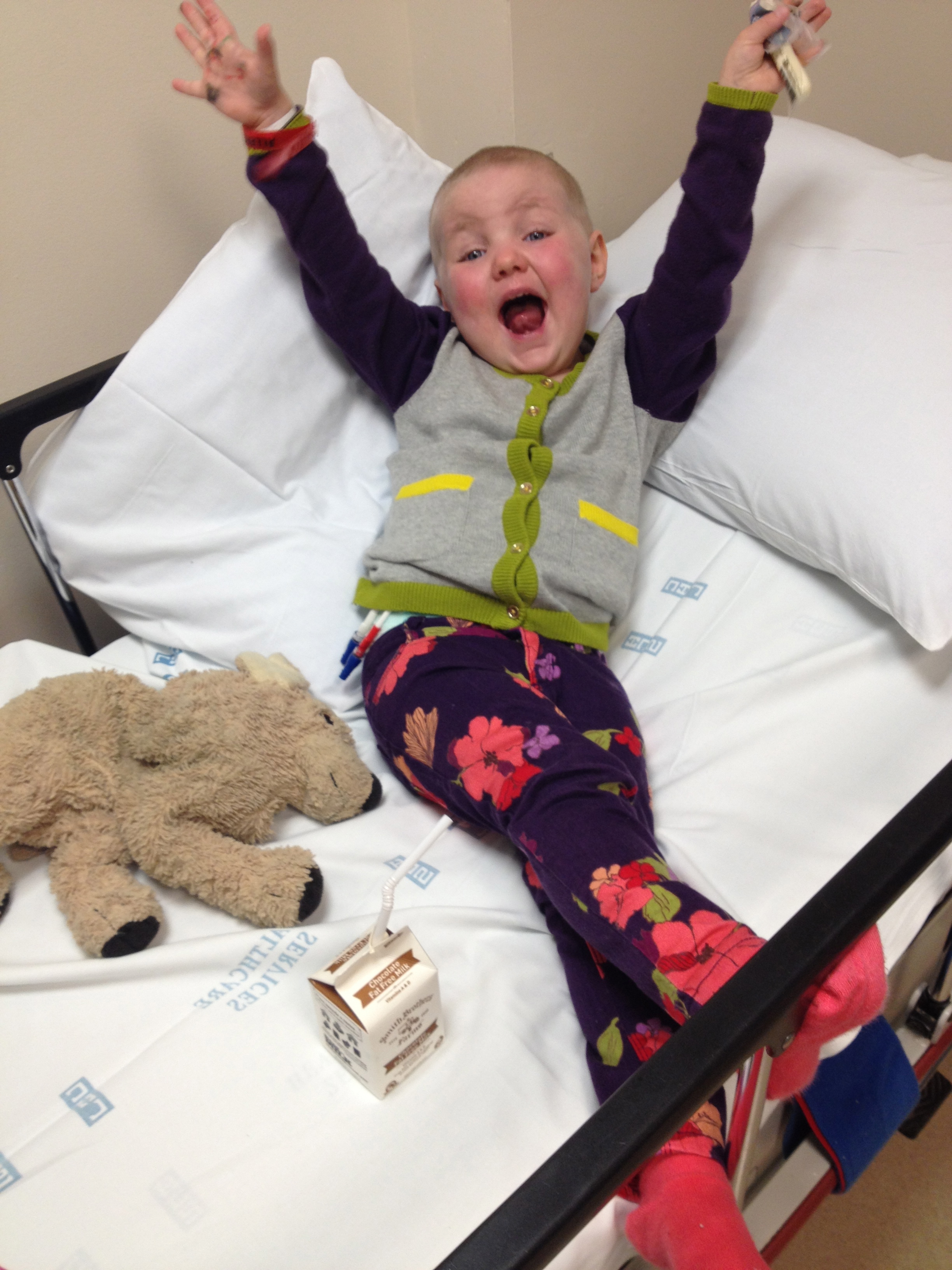 By all appearances, however, Allistaire really is doing great. She completed her steroid taper this past Saturday and is now on only 3ml of Prednisone every other day. Her appetite is not spectacular and it still takes an extraordinary amount of time and prompting to get her to eat her three meals everyday but she has only lost .1 kg since she was weighed at Children’s last week. Dr. Ostrowski thought she looked slimmer in the face and tummy today since last she saw her a several weeks ago. To use my brother’s words, “she looks deflated.” It is likely that she has and/or will lose some water weight as the steroids cause you to retain fluid. She’s sleeping, peeing, and pooping well. There’s no sign of a skin rash. No vomiting or fevers. And energy? She outlasts Solveig. Solveig will eventually slink away to her room or the living room chair to indulge in a book only to have Allistaire track her down and plead to do more of their spinning games or perhaps another round of being kitty’s together or playing rodeo where they take turns doing tricks with their stick pony, and saying things like, “Good girl, Flower. That’s a good job.” So far no apparent GVHD flares or other outstanding issues.
