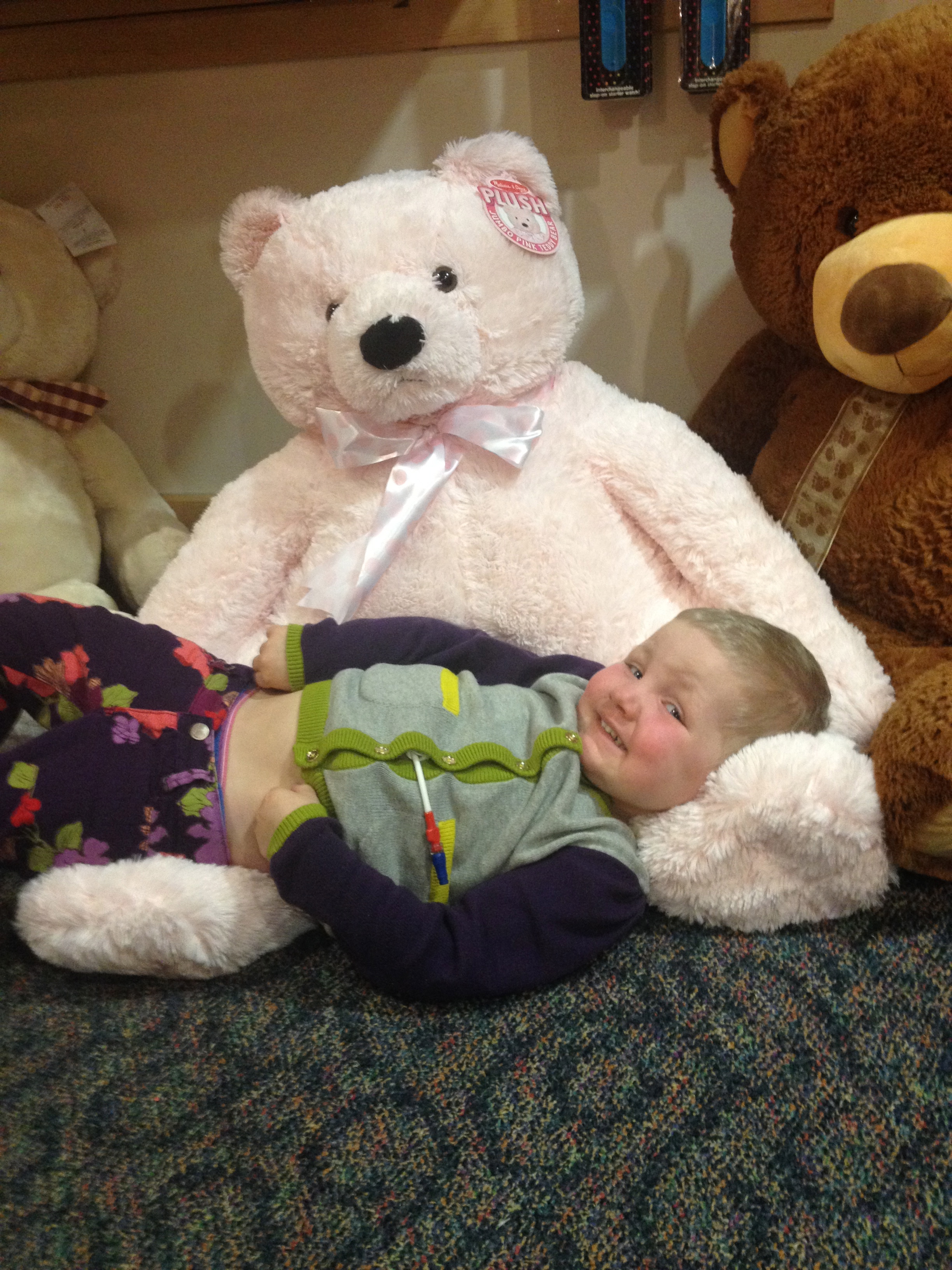 That same night as I went to remove Allistaire’s dressing for a dressing change, I noticed blood.  The skin under her dressing has been having a really rough time the last two weeks and hasn’t been able to heal up and I assumed the small bit of blood to be her skin weeping.  As Sten and I went step by step through the dressing change, we suddenly saw great fat drops of brilliant blood on the blanket.  Another hole in the line, on goes the bull dog clamp, the alcohol wipe and the gauze.  I call Dr. Ostrowski and determine our plan.  Not long later, Allistaire and I are at the ER to get blood drawn for blood cultures to look for infection and to get a dose of the antibiotic Rocephin.  Because it was impossible to draw blood from her now defunct line, she had to have blood drawn from her arm.  I circled my body around her, legs entwined over her legs and arms holding down her arms and she screamed with face bright red, quick streams of tears and entire body flexing in absolute protest.  A little later, once that terror had passed, I pulled down her jammies to expose her upper thighs and the nurses came in coordinated assault, plunging the matching needles into her legs, administering the dose of antibiotic, and again the terror and tears and the circling her body in hug.