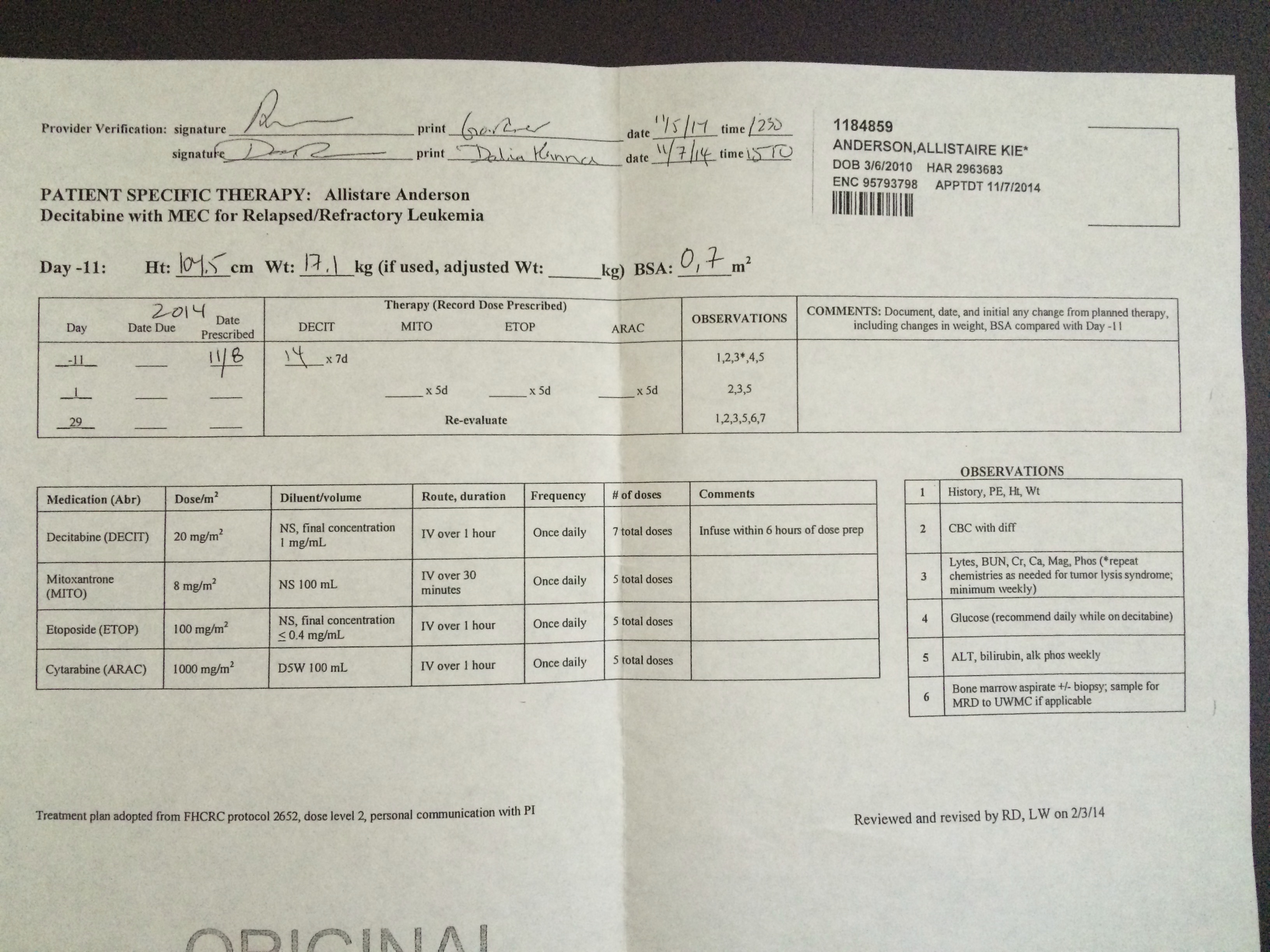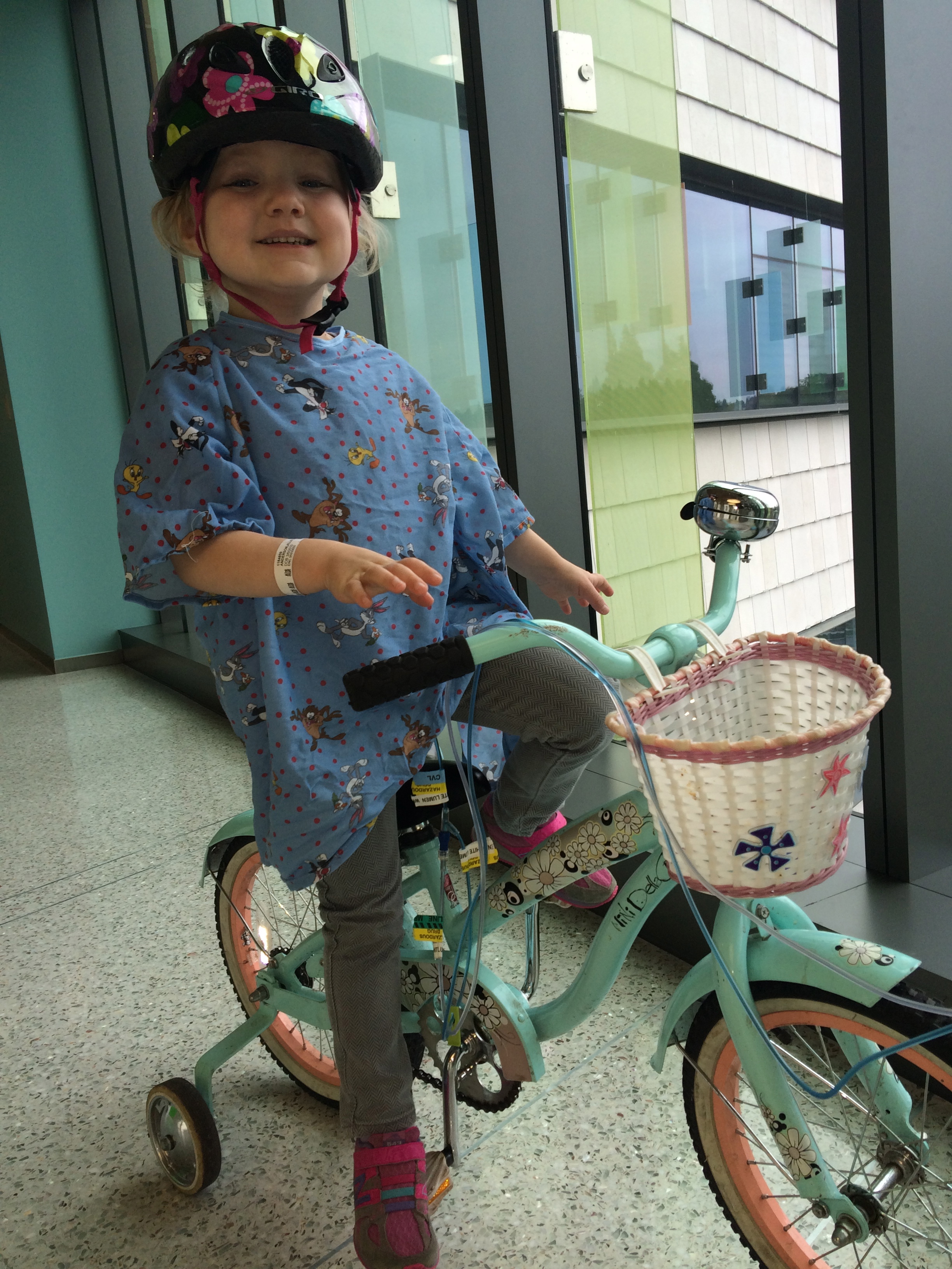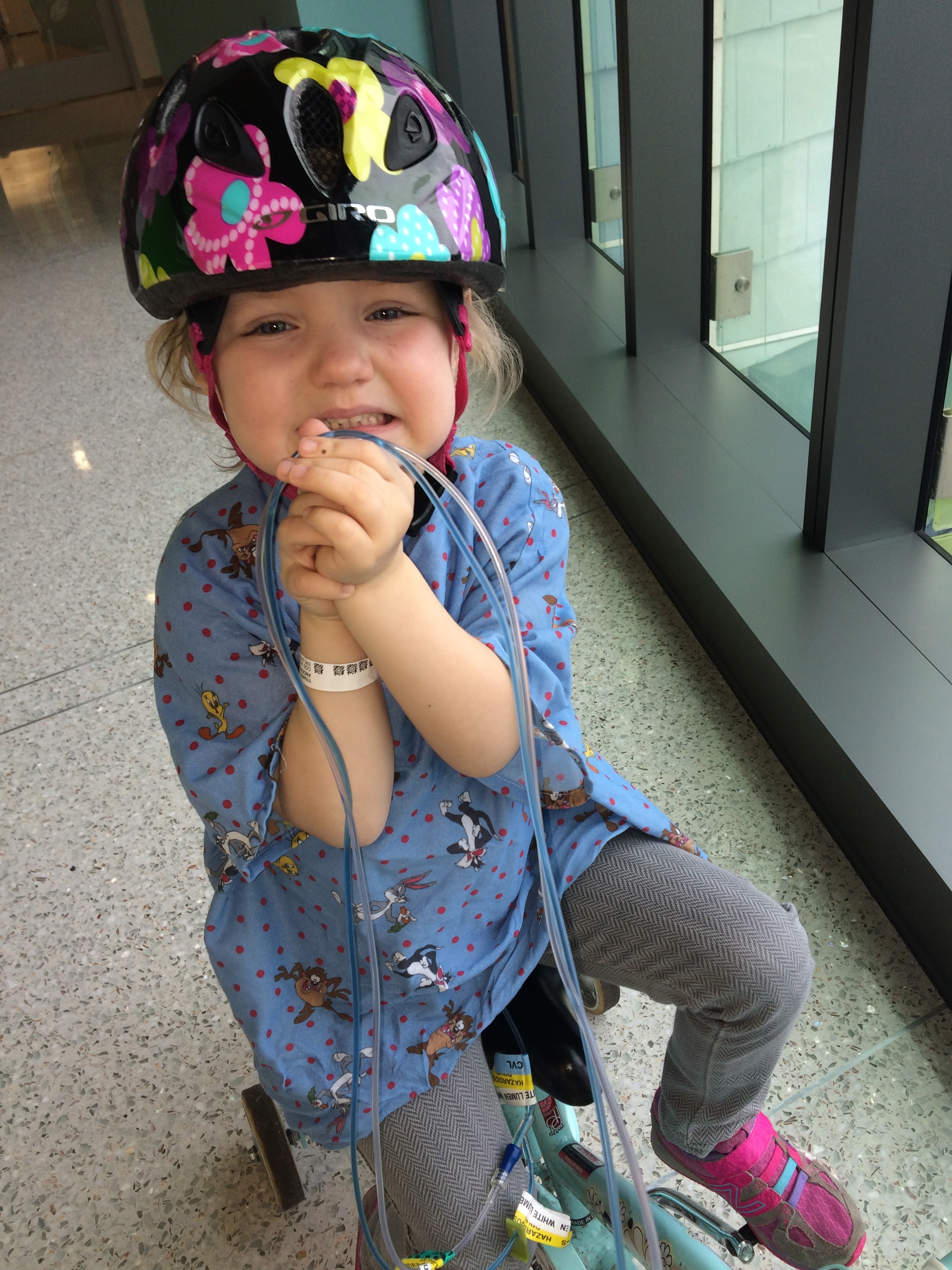 A couple little details: The pictures showing Allistaire’s lines with blue is the Blue Thunder chemo (officially Mitoxantrone). She’s completed 3 out of 5 days of chemo and is doing well – no throwing up, slightly decreased appetite. Her fatigue has increased which means we’re back on the old schedule of a nice long afternoon nap. All her labs look good. The blasts have not reappeared which is to be expected as her blood counts drop. Today both her platelet count and hematocrit were at about 25. She will get red blood when her hematocrit reaches 20 and platelets when they reach 10. At home she had just finished all of her meds with the exception of Enalapril for her heart, vitamin D and Multi-Vitamins. She continues on these but now also has Fluconazole (anti fungal), Bactrim (antibiotic) and Allopurinol (helps clean out all the cancer cell gunk that spills into the blood during tumor lysis/death of cancer cells). Every four hours she gets eye drops to prevent complications from high-dose Cytarabine. The picture of Allistaire with the other girl is our friend Piper who is now 10. She was diagnosed with AML two weeks after Allistaire back in December 2011. She relapsed in November 2012 and got a bone marrow transplant in February 2013 and is doing well. Lastly, I have included a few old pics just to lend perspective. Note the same pink helmet from first diagnosis and a couple picks with Piper from diagnosis and first relapse. Only four more days until Sten flies in and five before Solveig, JoMarie and Lowell get here. We are excited!!!