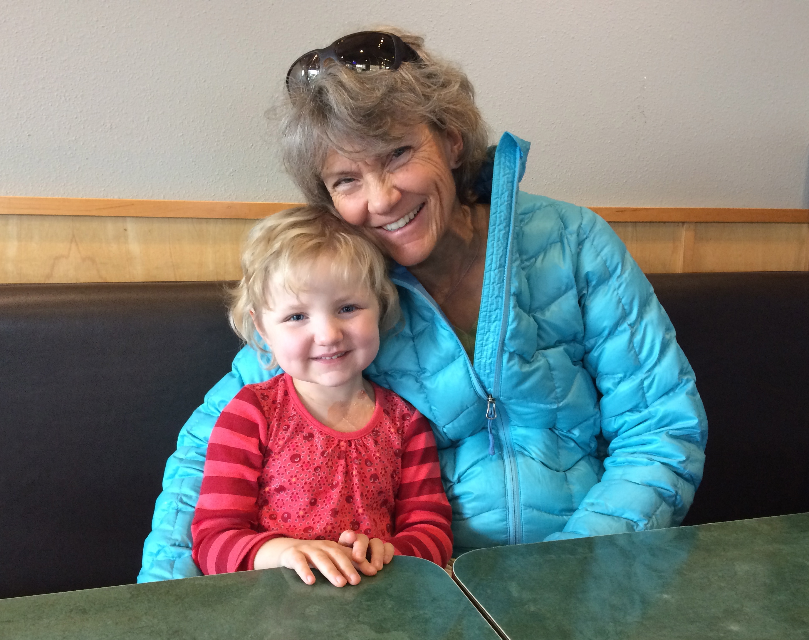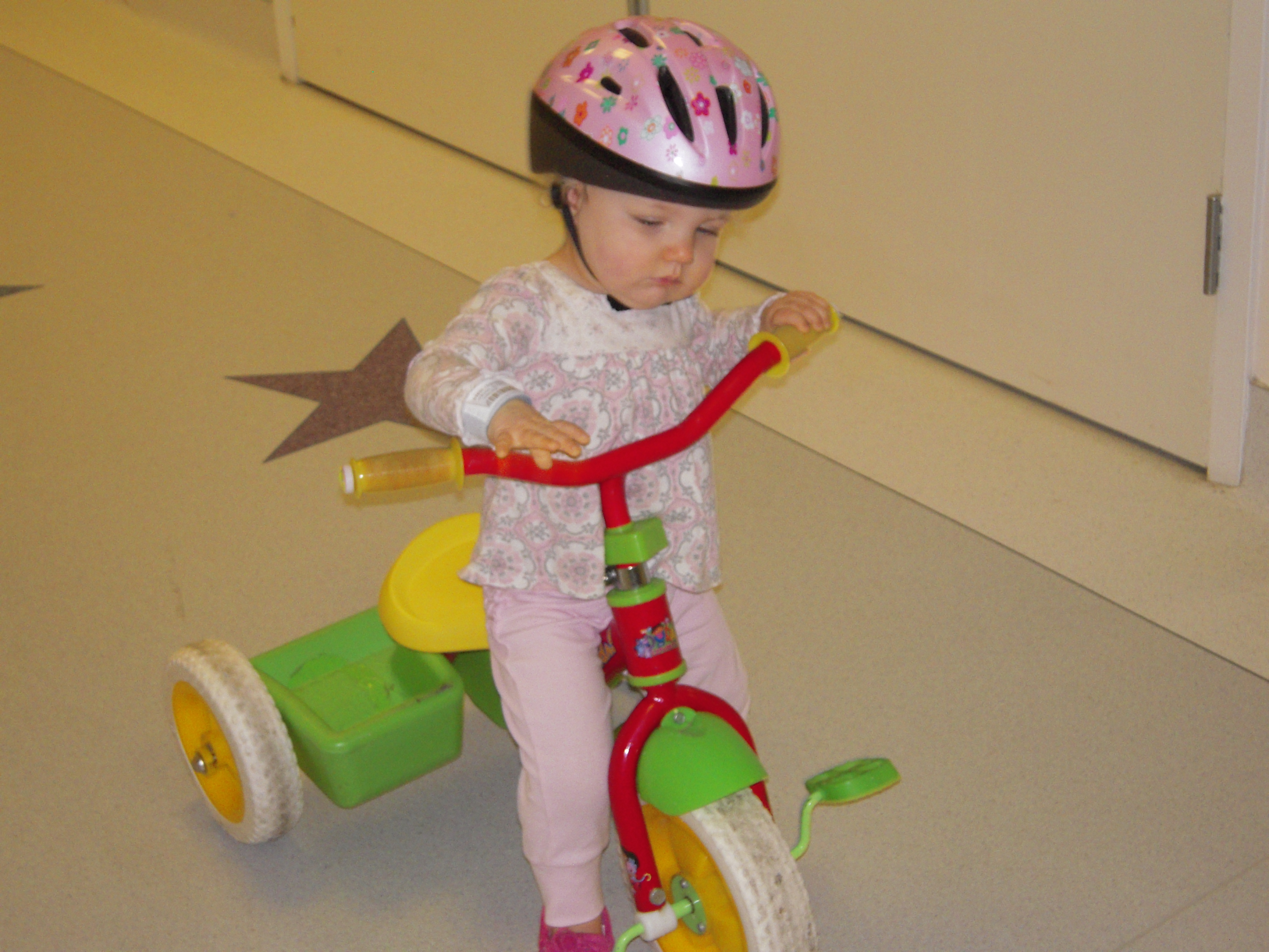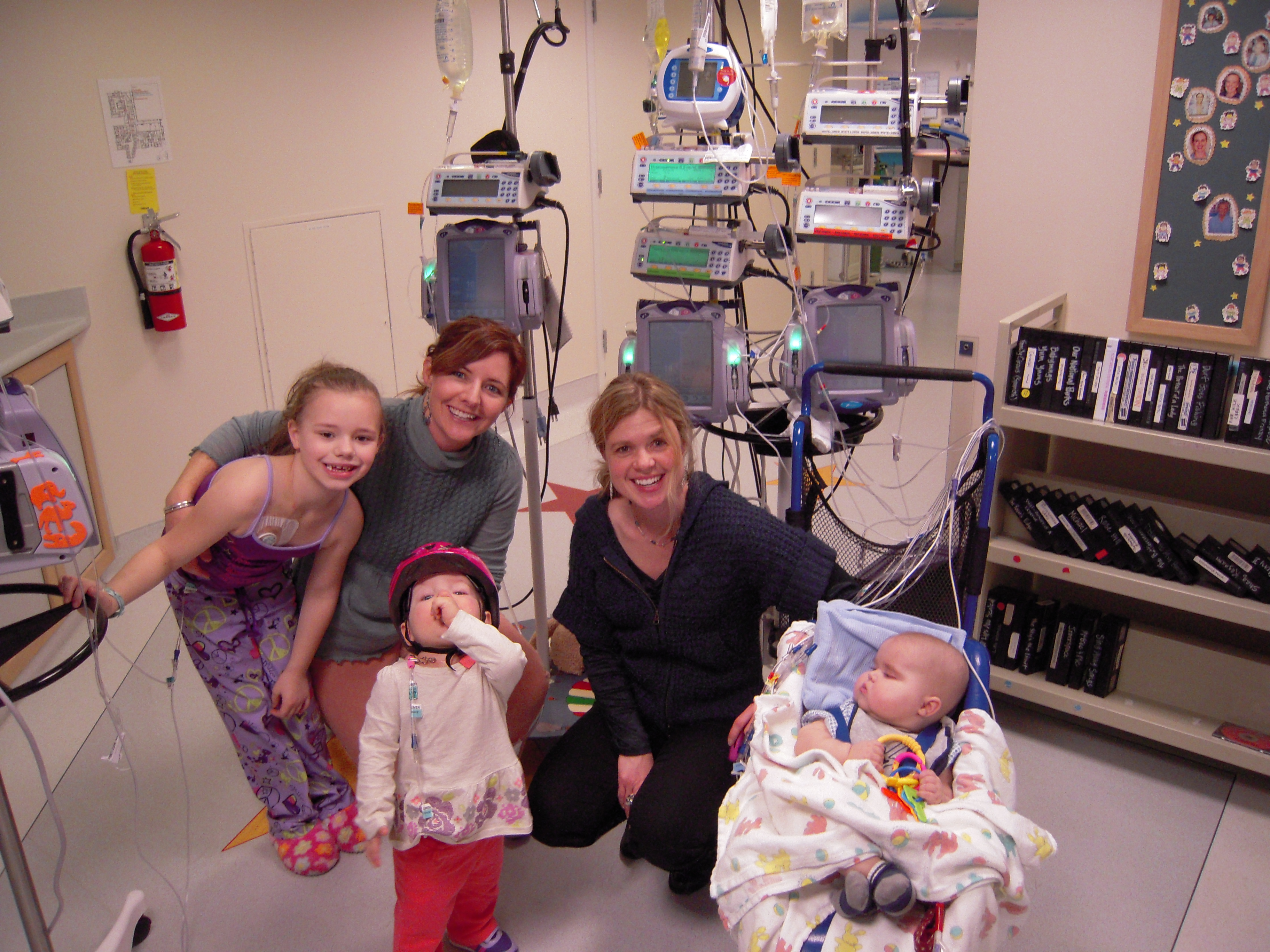A couple little details: The pictures showing Allistaire’s lines with blue is the Blue Thunder chemo (officially Mitoxantrone). She’s completed 3 out of 5 days of chemo and is doing well – no throwing up, slightly decreased appetite. Her fatigue has increased which means we’re back on the old schedule of a nice long afternoon nap. All her labs look good. The blasts have not reappeared which is to be expected as her blood counts drop. Today both her platelet count and hematocrit were at about 25. She will get red blood when her hematocrit reaches 20 and platelets when they reach 10. At home she had just finished all of her meds with the exception of Enalapril for her heart, vitamin D and Multi-Vitamins. She continues on these but now also has Fluconazole (anti fungal), Bactrim (antibiotic) and Allopurinol (helps clean out all the cancer cell gunk that spills into the blood during tumor lysis/death of cancer cells). Every four hours she gets eye drops to prevent complications from high-dose Cytarabine. The picture of Allistaire with the other girl is our friend Piper who is now 10. She was diagnosed with AML two weeks after Allistaire back in December 2011. She relapsed in November 2012 and got a bone marrow transplant in February 2013 and is doing well. Lastly, I have included a few old pics just to lend perspective. Note the same pink helmet from first diagnosis and a couple picks with Piper from diagnosis and first relapse. Only four more days until Sten flies in and five before Solveig, JoMarie and Lowell get here. We are excited!!!