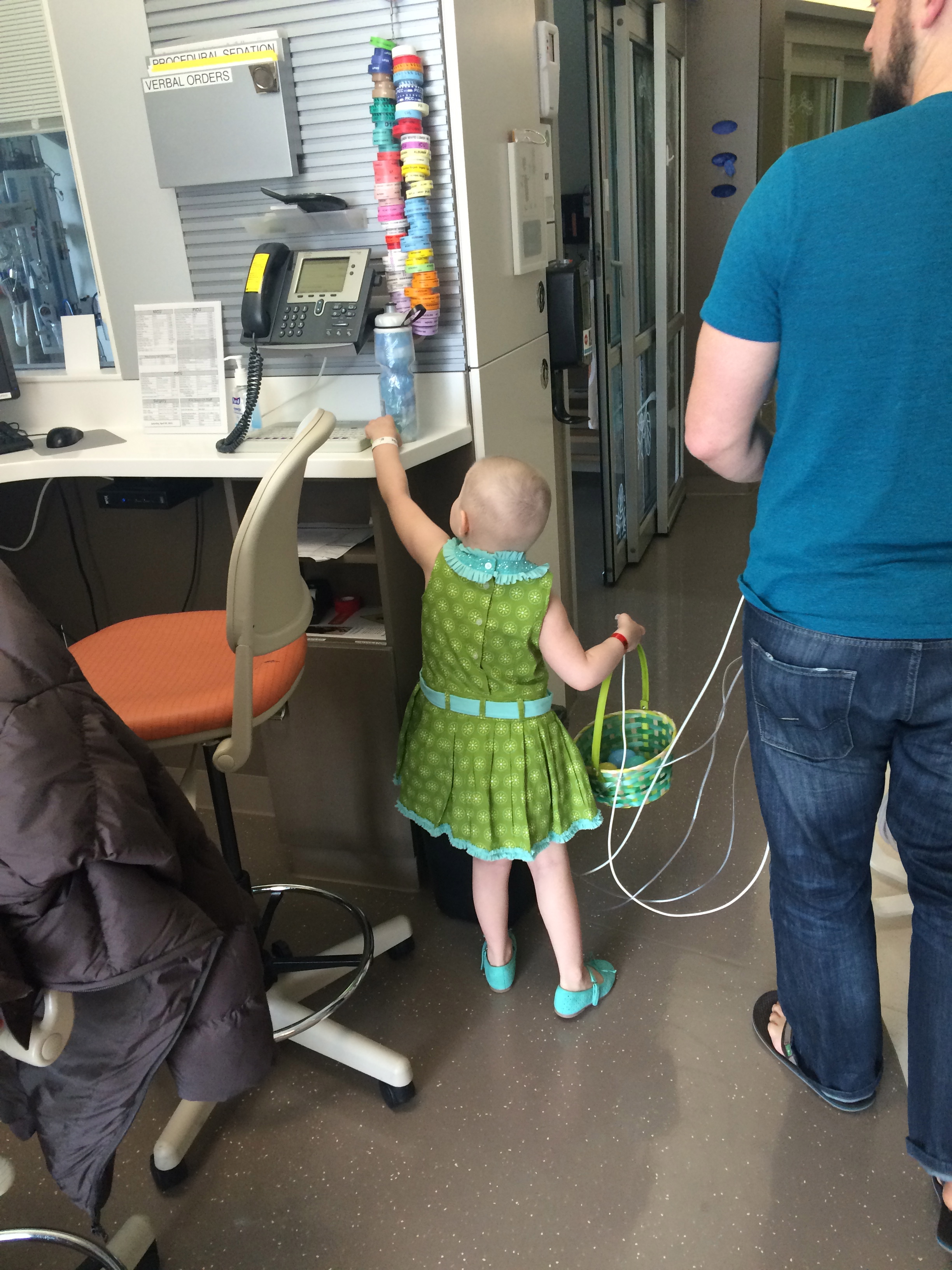 For 11 of the past 12 days since she was discharged, Allistaire has been to the hospital for a variety of appointments. On Tuesday the 19th she finished focal radiation to her left leg where one new chloroma (solid leukemia) showed up on her last PET/CT scan. On Wednesday she saw Dr. Todd Cooper, her new primary oncologist. Dr. Gardner is pregnant with twin girls and so we are making the transition to having Dr. Cooper, who is the newly hired head of the leukemia department and an AML expert. He is the doctor that Dr. Pollard had hoped would come to Seattle Children’s. He has been tasked with developing a High-Risk Leukemia program for Seattle Children’s. So when Dr. Gardner asked who I’d like to have as Allistaire’s new primary oncologist, it was a no-brainer to ask for Dr. Cooper, a kind man from Atlanta who is a super smarty pants AML doc. In our first outpatient visit with him, he relayed that Dr. Pollard had called him about Allistaire to make sure he was up to speed with all the details of her medical history. I cannot tell you how amazingly cared for I feel here at Seattle Children’s. We are blessed beyond words by the team that journey’s with us. After seeing Dr. Cooper, Allistaire began seven days of Azacitadine, the same chemo she got last time.