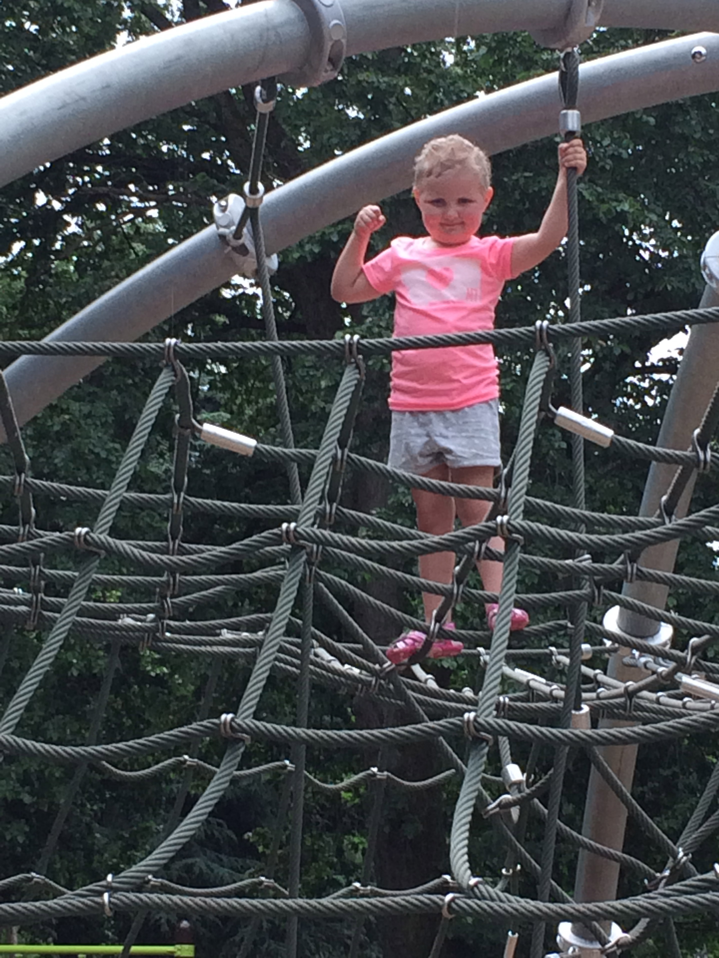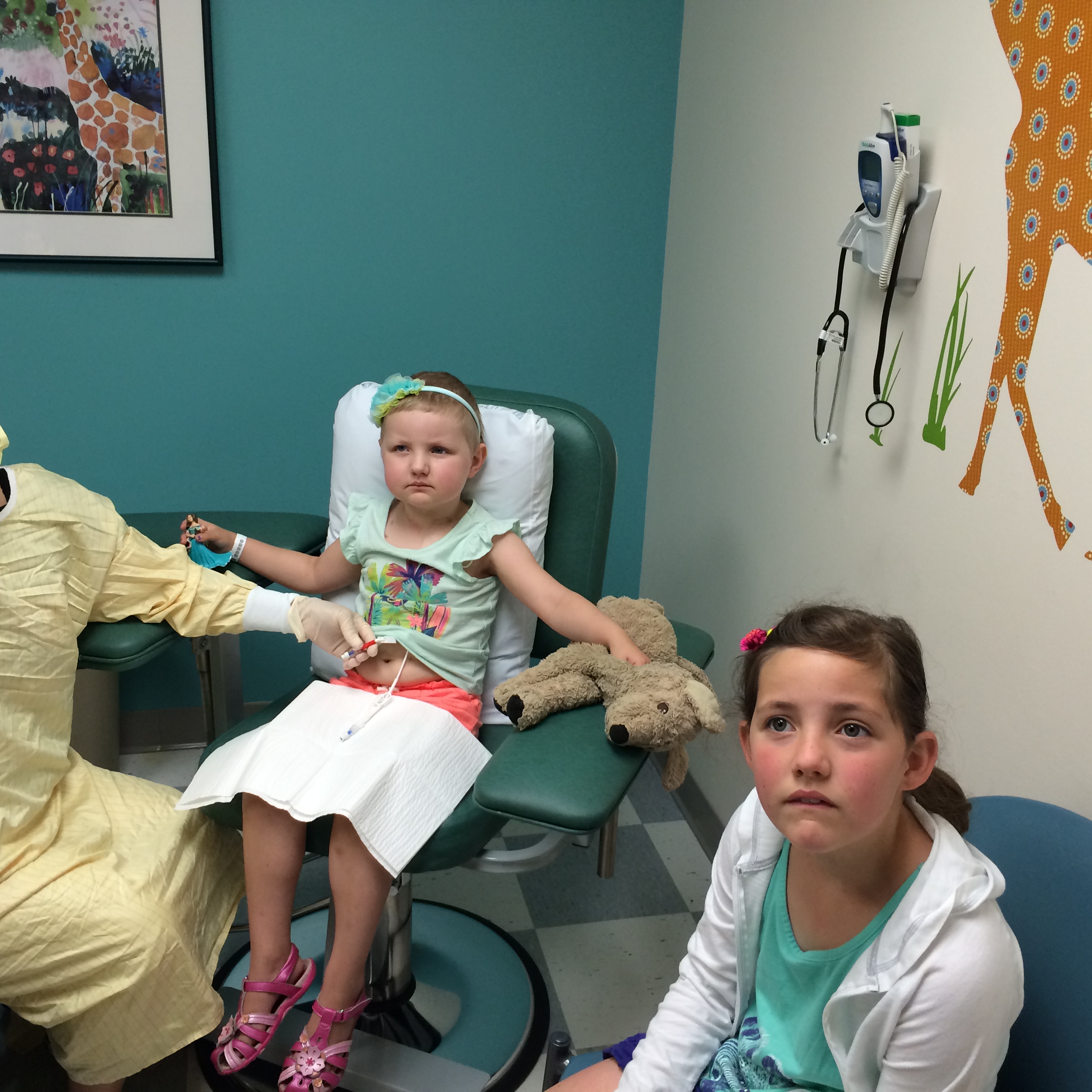 In the time we waited for everything to be arranged, Dr. Tarlock consulted with cardiology about how much fluid Allistaire could handle on her own and she began receiving just 60ml an hour of saline. To lower Uric acid levels, she was given a dose of IV Rasburicase. She was also given Sevelamer to bind with phosphorous. The problem is, Sevelamer can only bind with phosphorous in the gut, not in the blood stream. Because Allistaire’s phosphorous was so high, Dr. Tarlock feared this would not be enough and we would need the aid of dialysis. At last we were settled in our room in the ICU. Yet when the labs drawn at 2pm came back, everything was trending in a much more positive direction due to the interventions already taken. About ten minutes into a fascinating conversation with the Interventional Radiologist about collateral veins that a young body like Allistaire’s form when other veins are damaged, the ICU attending came in to say we were going to hold off on dialysis for now and continue to monitor labs. It ended up being a crazy short and remarkably easy ICU stay. Basically Allistaire just watched movies, got her meds and some IV fluids while I tried to get food in her and grumbled that I couldn’t eat in the room. Because Allistaire was scheduled to get her second dose of Mylotarg on Saturday, we were just going to stay inpatient through Sunday with frequent labs to quickly deal with any issues if they should arise. Friday morning we were to transition upstairs to the Cancer Unit except that they had no rooms available. Finally on Saturday afternoon, we moved upstairs to the Cancer Unit into the radiation room – a room specially designed to give MIBG radiation to neuroblastoma patients. It is a lead-lined room with most surfaces being stainless steel. It’s not the most cozy room and the bed is about a foot to short due to having to accommodate the thicker lead walls. But it meant getting the show on the road and I didn’t care. I just wanted to get the Mylotarg in and get out of the hospital. At long last, on Sunday afternoon we burst out of the hospital into the blaze of a 95 degree day, having completed the second dose of Mylotarg with absolutely no issues, no fevers and labs still looking great.