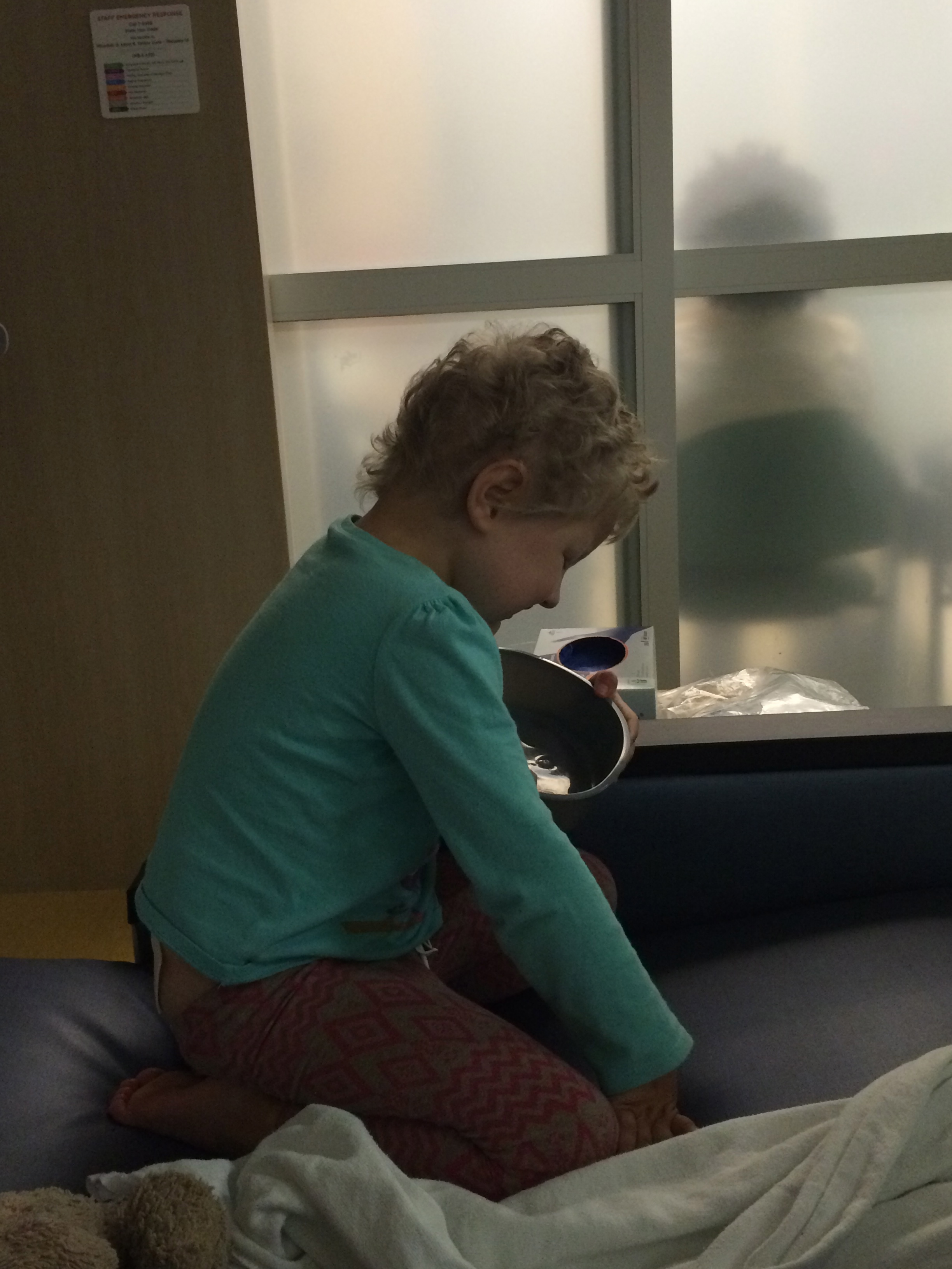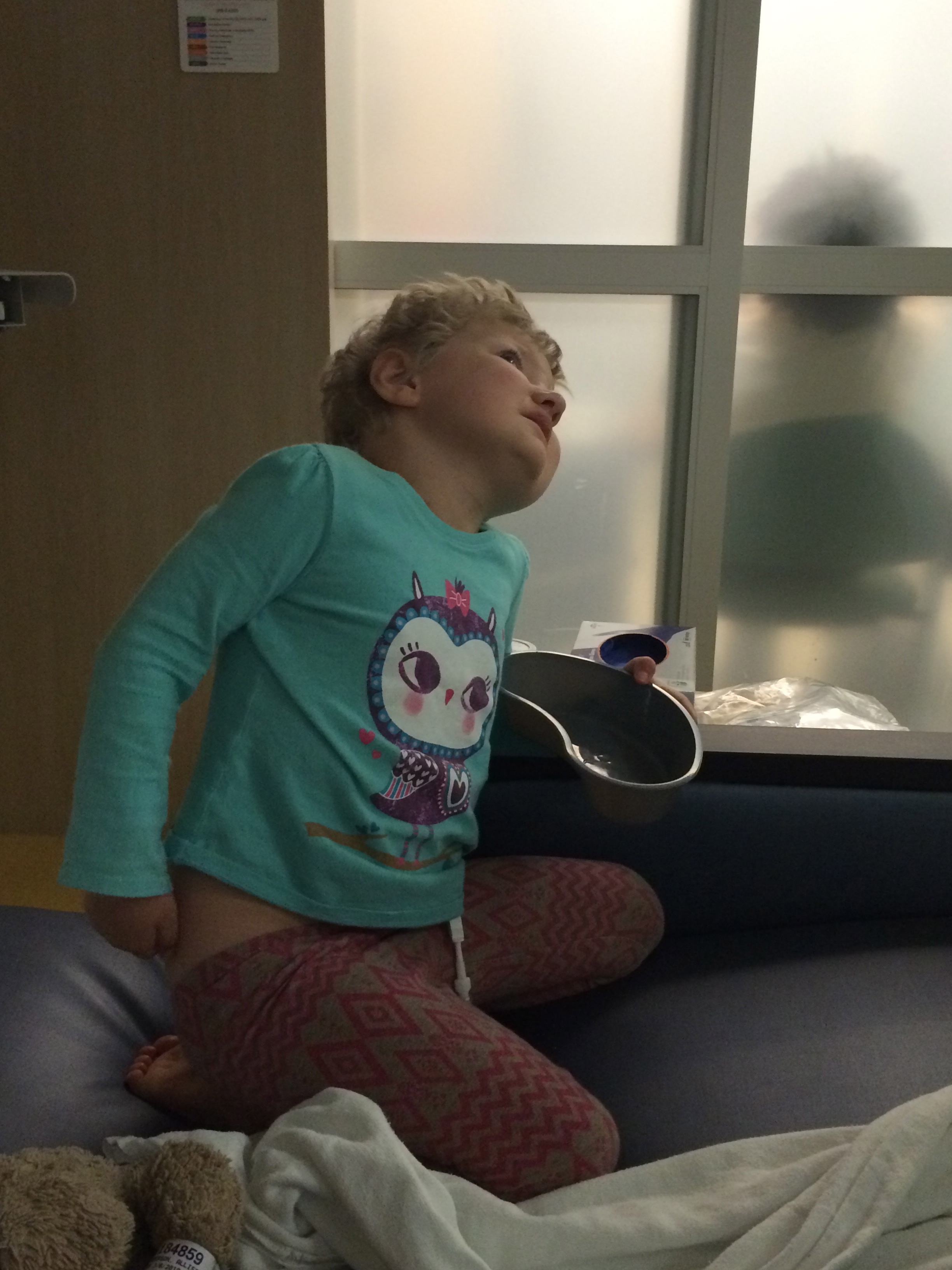 In rounds Friday morning we discussed the possible advantage of a NG tube known as a Salem Sump which, using intermittent suction, pulls out gastric contents. The GI doctor did not think it was medically necessary for Allistaire to have one but was in full support to provide her comfort. Once Allistaire agreed to the tube, Catherine, one of the charge nurses, gathered the necessary materials and graciously talked Allistaire and I through the process. Allistaire sat on my lap with my arms around her. She was very brave, though terrified. The tube going down her throat caused her to gag and throw up and tears streamed down her face as she kept drinking at the insistence of the nurse in order to help the tube go down. Catherine did an excellent job and got it just right on the first try.