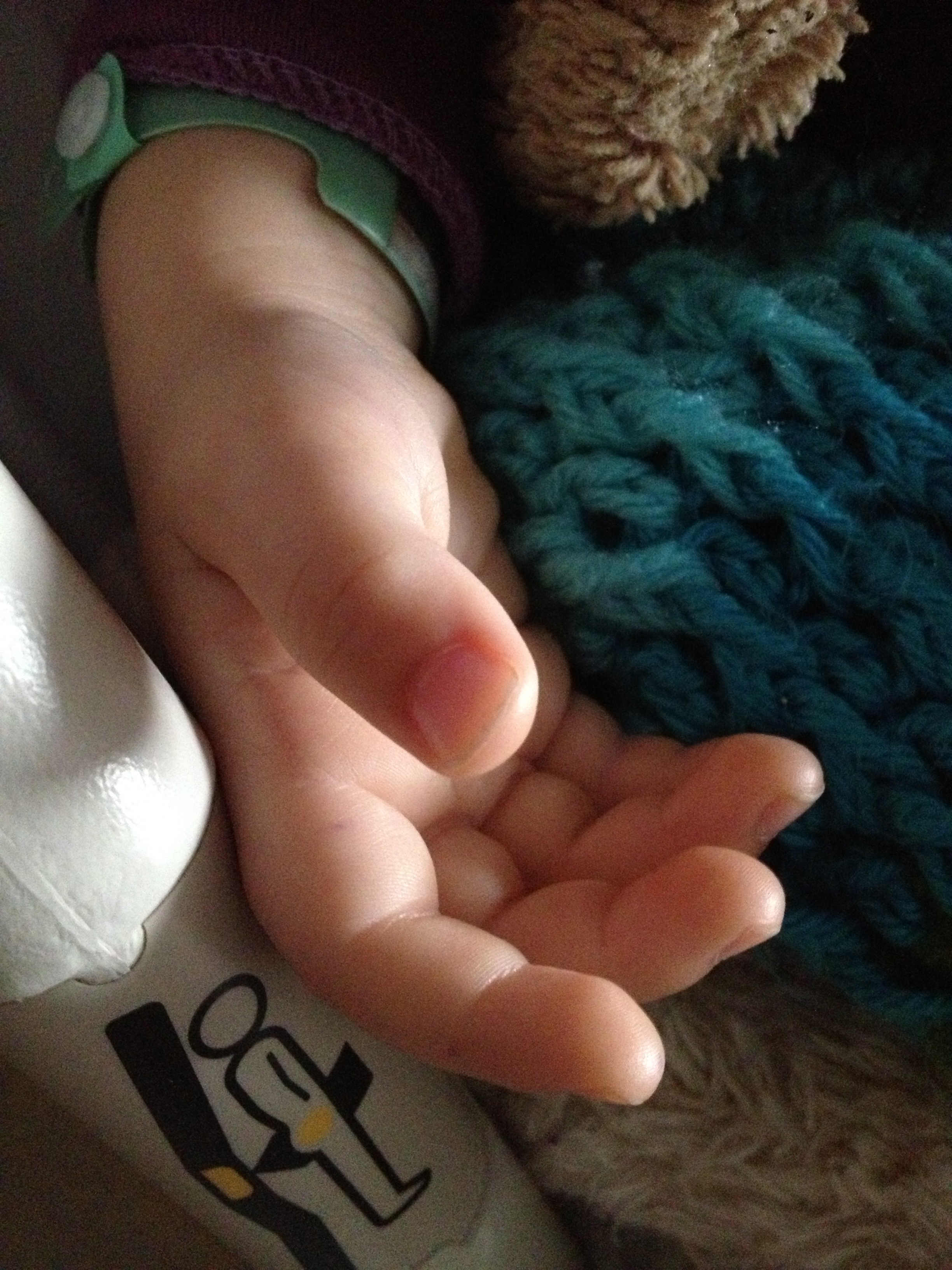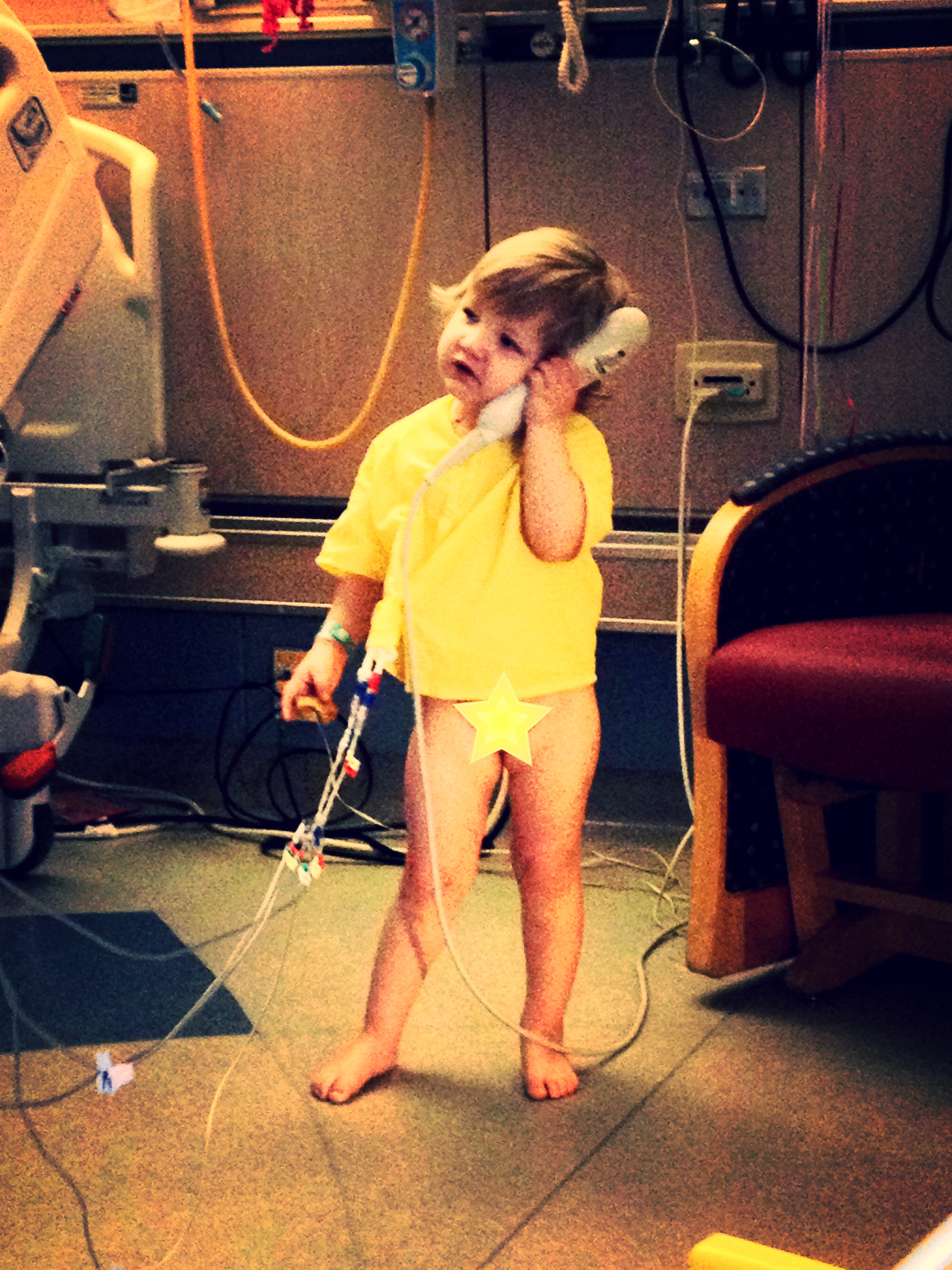 I don’t know how to take this reality into myself. I say the word, “death,” because I want to take away some of its severing power and pain. I look at the white board that counts down the days until we move into the new hospital and I say out loud, “I wonder if we will ever be there.” In my mind I form the thought, “what if my love is the first to die in that place, that place “made not of just concrete and steel, but of hope” as the sign says. I push the words and thoughts out. I force them to move outside of me because I cannot bear to hold them in. I want her hair to fall out because I want that chemo to work damn it! But then I think, what if these are the last days I run my fingers through these flaxen locks. Some may think I focus too much on the possibility of losing her, that instead I should set my hopes on her healing, her cure. But what if our days with her are so short? What if I have gone about assuming I have more time with her and in doing so I don’t pull her into me as much as I could have. I might have years with her. I might have months. I might have days. I want to listen to her voice. Watch the way she sticks her tongue out to the side when she concentrates on a task. I want to take in the curve of her long dark lashes. I force myself to look upon her beautiful chubby legs when I change her diaper. There I see the bruises. Bruise blue, bruises brown, bruises yellow. Another bag of platelets hangs from her pole.