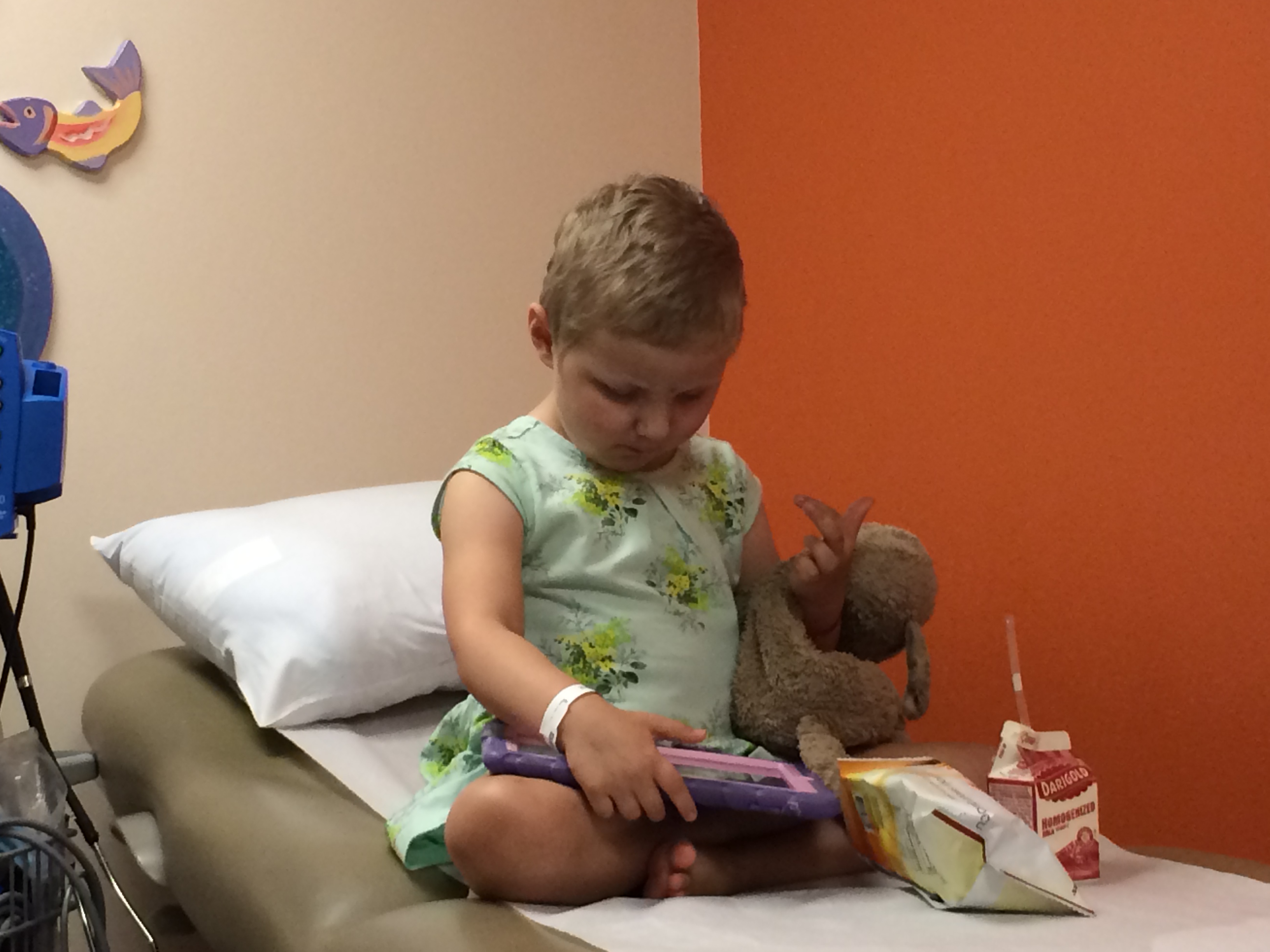 Late on Thursday evening Allistaire and I arrived at my parents house with the plan to stay the night and get up early the next morning to pick Solveig up from camp.  I so wanted to see her little eager face, to have her tell me all about her week.  I wanted to see the transformation from the scared, nervous girl I dropped off on Sunday to the one that would be beaming with joy.  We had been in the house no more than 5 minutes when I felt Allistaire’s face as she nuzzled up against my leg, having returned from the other room ready to change her attitude.  Oh my gosh she is so warm.  The internal debate, the desperate desire to ignore what I sensed flooded me with heat but my mind sternly declared, “Take her temperature,  just do it, you must.  It doesn’t matter that you just drove all the way here and may have to turn right back around.  Focus.  Take her temperature.”  Solveig’s sweet face lingered in my mind.  I turned to Allistaire.  102.4  A fever.  Oh crap.  We’ve got to go, we’ve got to go.  Allistaire has no ANC, she has no defense.  Something is brewing in her and things can move fast.  103.5  We were out the door and back on the road, speeding through the night.  I talked to the Hem/Onc Fellow on call.  I want blood cultures and antibiotics ready for when we get there.  I talked to the ER.  I don’t want to have to wait.  I drove 70 mph the whole way, rehearsing in my mind what I’d say to the officer if I was pulled over.  Allistaire cried and cried, so sad to not see Sissy.  My jaw was clamped closed, hands gripped on the steering wheel, intent, scanning the night.  My whole heart screamed out into that darkness, “But I have TWO daughters!”