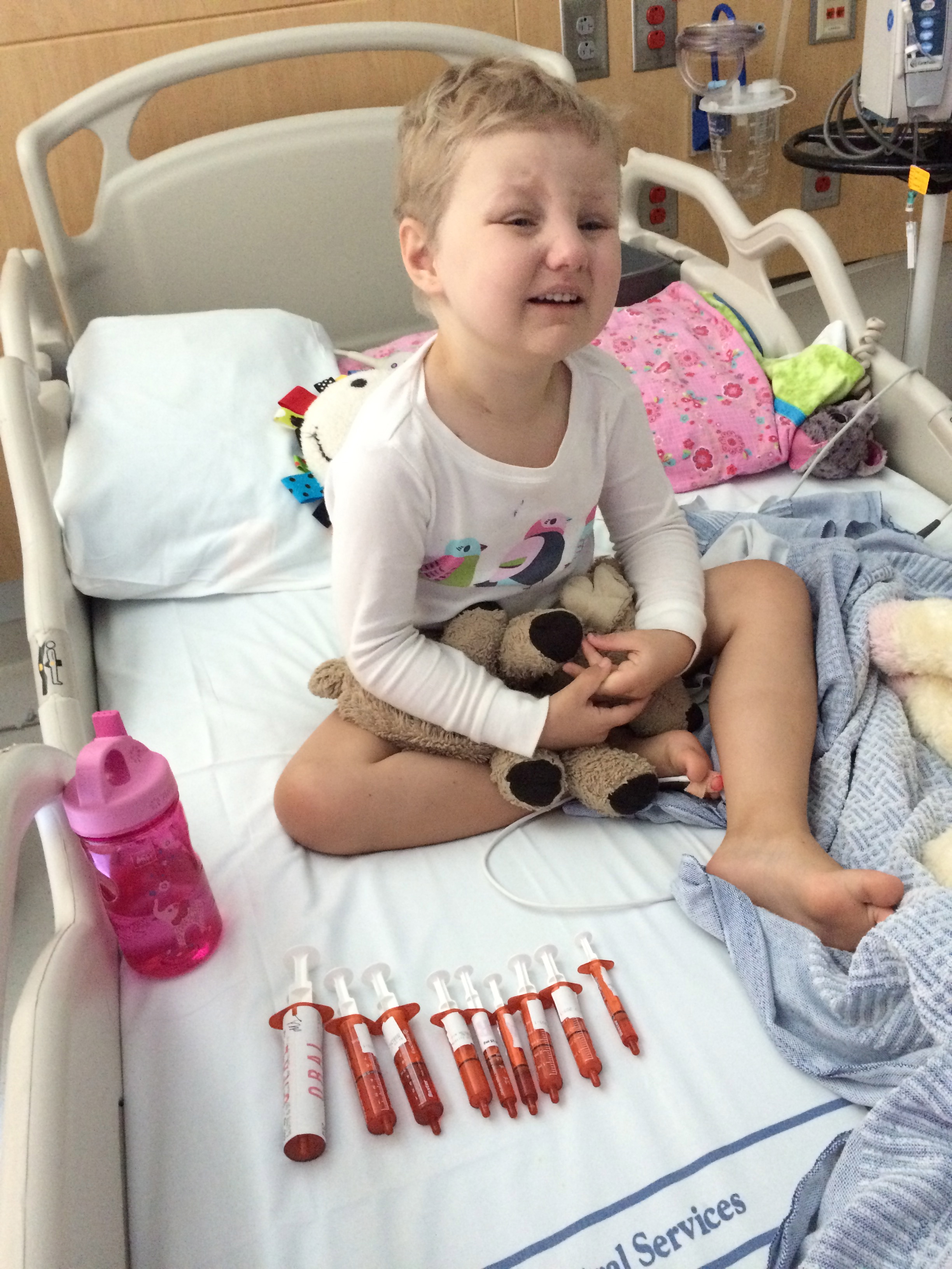 So it turns out Allistaire’s Digoxin level was 5. The goal range is .5 to .8 with 1 being fine and anything over 2 being bad news. Digoxin originates from Foxglove and in high doses can be very toxic. Her Digoxin was immediately held in order to get the level down.  It wasn’t until about a week later that I thought to look up side-effects of Digoxin toxicity.  Though these are listed as “less common”, I’m guessing having a level that is 5 to 10 times higher than desired might amp up these effects.  “Agitation or combativeness, anxiety, confusion, depression, diarrhea, expressed fear of impending death, vomiting, loss of appetite, weight loss, low platelet count.”  These are just the ones listed that seem to directly relate to what Allistaire was experiencing.  In addition, her Pozaconazole level, an anti-fungal, was about 4,000 when the goal level is 700.  Some “more common” side effects of pozaconazole are, “abdominal or stomach pain, body aches or pain, confusion, diarrhea, nausea or vomiting.”  Other less common effects include “anxiety, change in mental status, mental depression.”  Again, I have only listed those side effects which I specifically saw Allistaire exhibit.  I only thought to look up side effects later because of the dramatic improvement she made once her Digoxin was stopped to get the level down and the pozaconazole was nearly cut in half.  There was a night and day difference.  The girl who fought me for an hour on meds can now take them in 3 minutes.  She is not afraid anymore.  I did switch to lactose free milk at the same time her pozaconazole dose was decreased, but either way, her stomach pain has reduced to nearly nothing.  She has been doing a much better job eating and has actually gained back  some of the weight she lost.