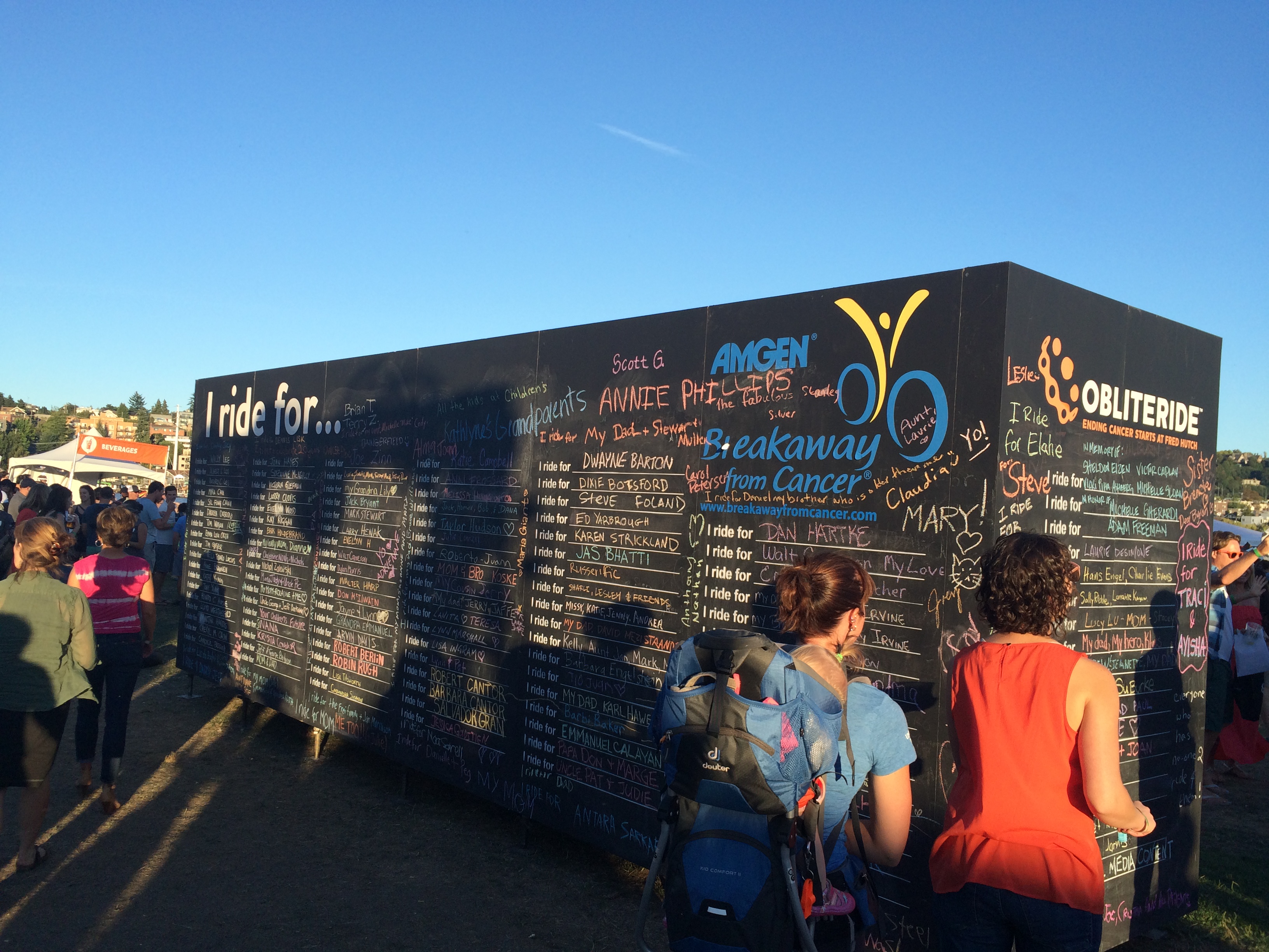 Yesterday evening I stood looking out across Lake Union toward the beautiful Seattle skyline, the sun having already set, leaving mellow pinks blending with the last of the day’s blue.  Behind me cheerful, high energy music played and hundreds of people gathered.  Doug, the camera guy, said it best – “beauty and affliction.”  There’s just so much of that.  How strange that the thread weaving all these people together, people dancing, drinking beer and chatting – we are all bound together by sorrow, by loss.  Last night was the big Obliteride kick-off party at Gasworks Park.  I had the opportunity to stand up for a few minutes and relay a bit of Allistaire’s story and the incredible need to advance cancer research.  I dwell within just one story among thousands and thousands, millions really, of stories about how cancer has stolen away those beloved, cherished, bright.  Today I have the joy of having some fun team time with the Baldy Tops. Tomorrow we will put into action all that we have prepared for.  We will swing our legs up and over that frame, hoist ourselves onto the seat, clip into pedals and at long last flex…will our legs muscles to contract, propelling us forward, down the route.