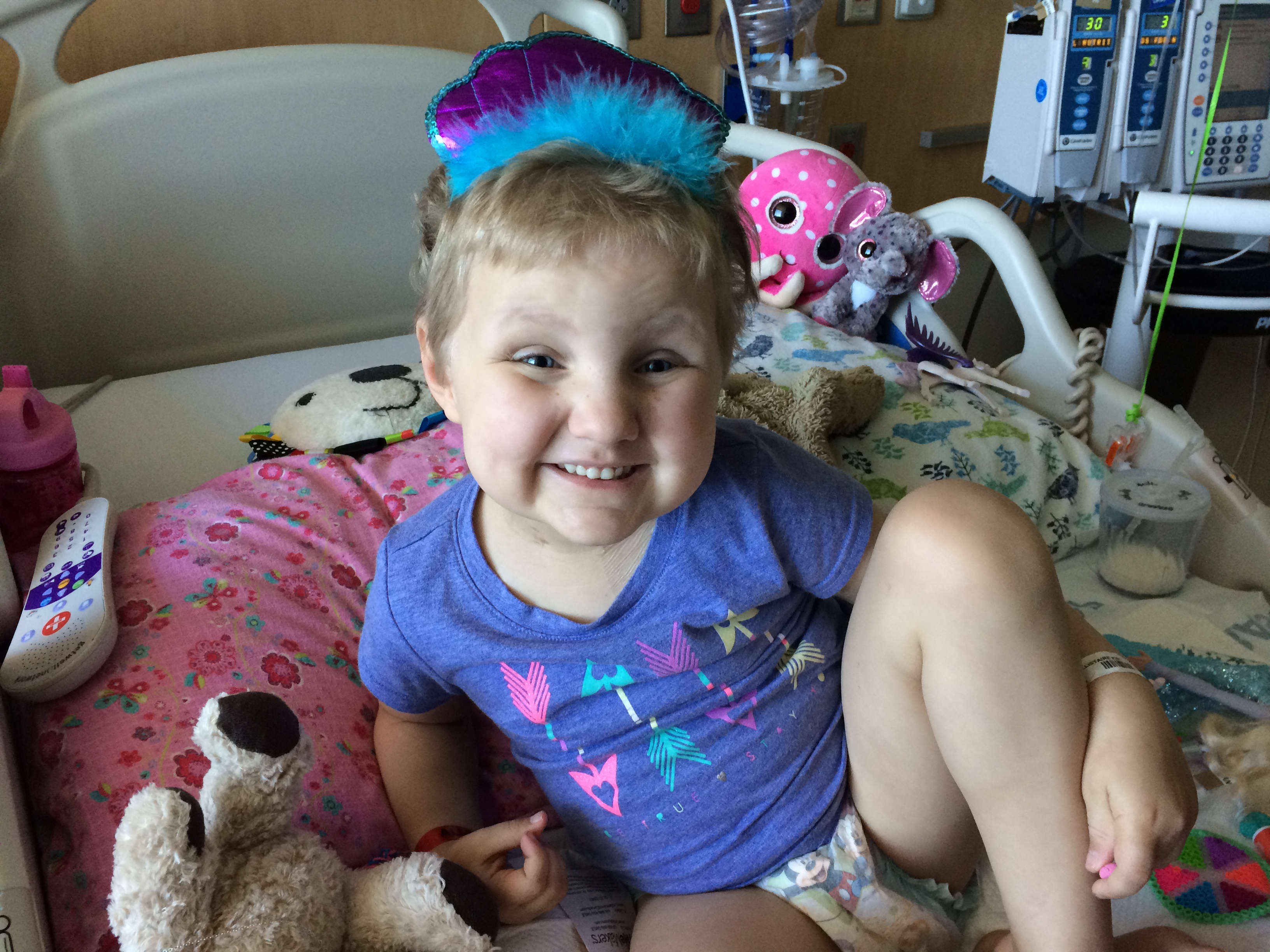 Not only does the ileus create immense pain for Allistaire which raises her heart rate but it also necessitates that she be on TPN (Total Parenteral Nutrition) which is essentially getting all of your food by IV since her gut is not functioning.  Being on TPN is viewed as a “Grade 3 Toxicity,” which in turn bars Allistaire from being eligible for the T-cell trial.  While we assume the ileus will resolve and she will have no problem eventually returning to eating normally, while on TPN she is disqualified from participating in the T-cell trial.  Because this means that the possibility of getting the T-cells is firmly put on hold until her gut starts to function again, the cardiac anesthesiologist did not feel it worth the risk for her to be sedated today (Tuesday) for the planned PET/CT, brain MRI and bone marrow aspirate used to determine the state of her disease.  The fact that Allistaire is throwing up would necessitate he put in a breathing tube during the sedation so that she won’t aspirate.  A breathing tube increases the risks of the procedures and he was considering arranging an ICU backup plan.  All her procedures have been cancelled for now and will hopefully happen the beginning of next week in hopes that with more time her heart function can improve and perhaps so will the ileus, thus reducing her vomiting and that all in all sedation would be less risky at that time.