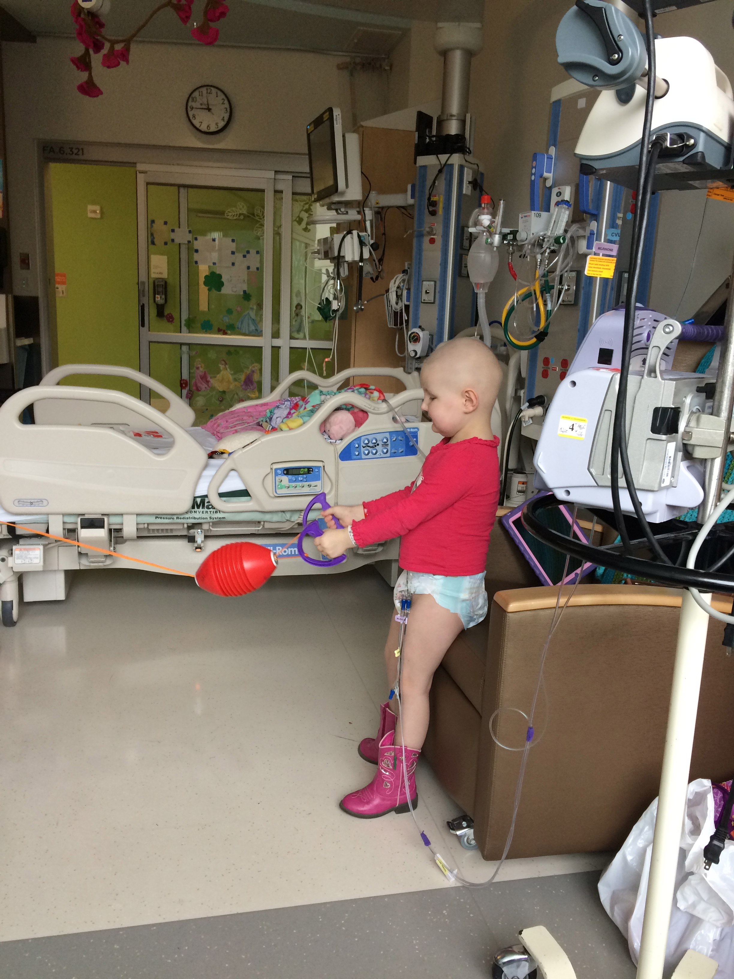 To come to this day, this day seemingly like hundreds of others, has required a hundred thousand minute steps. How many times has a nurse “entered” her line? Fifteen seconds of scrub time. Fifteen seconds of dry time. How many sets of vitals? How many CBCs (Complete Blood Count)? How many echos and bone marrow biopsies? How many times have her cells gone hurtling past a laser, striking that electron off to release a burst of energy at a precise wavelength to reveal its identity? How many transfusions of red blood and platelets? How many emails flying back and forth between doctors, careful to consider all facets of her case, what will be best? What meds? What protocols? How many great hurdles overcome? How many slim possibilities made real?