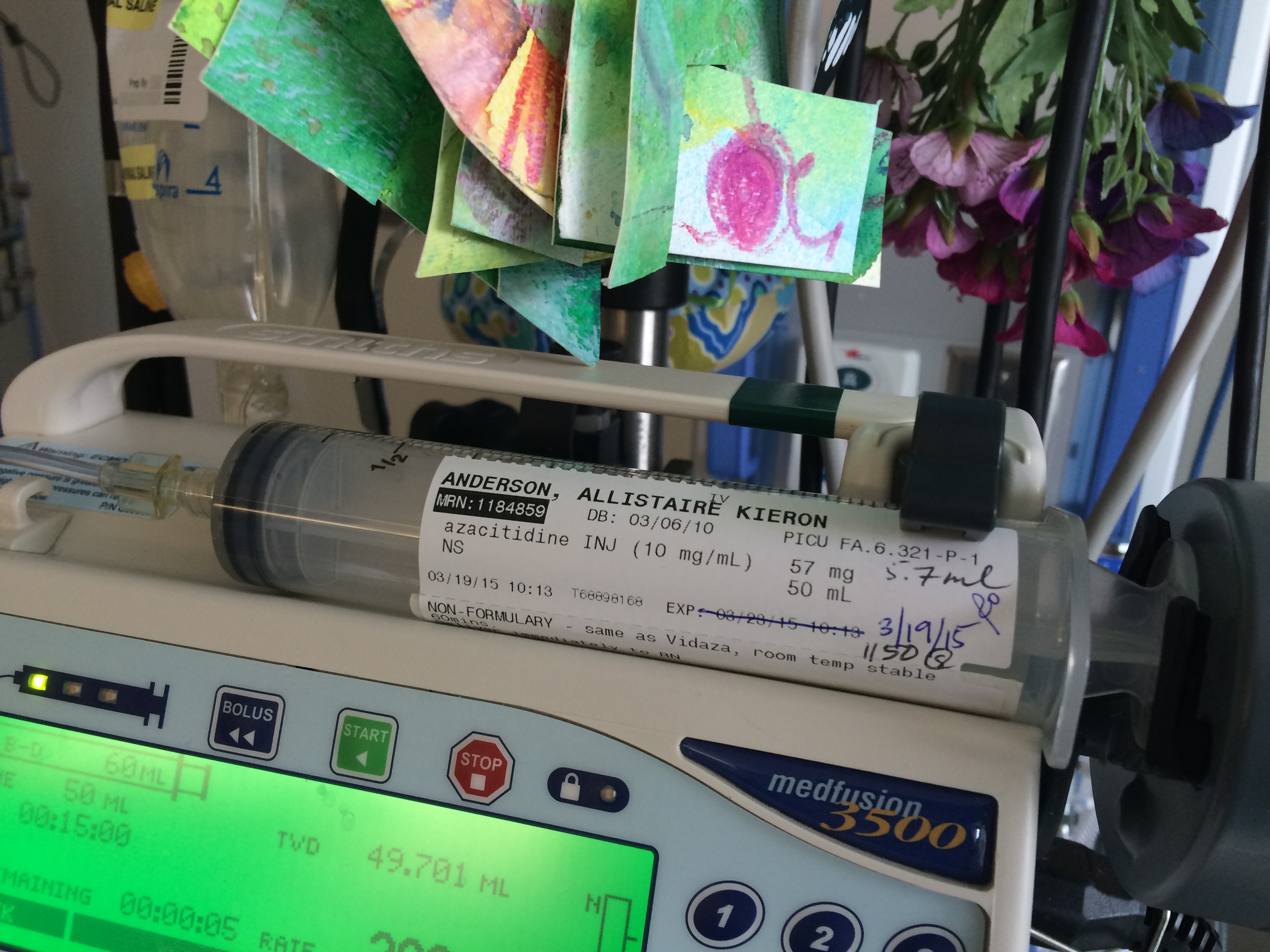 And there was something so poignant about the setting. The plan had been all along to put Allistaire in the ICU for the most crucial, dangerous portions of transplant. The ICU has many more means of monitoring her heart and an array of cardiac meds that cannot be given on the Cancer Unit. Allistaire cannot be handled by standard protocols alone. Everything that happens with intense immune responses result in the potential for great fluid shifts which in turn can radically impact the heart. The first event of concern was simply receiving her cells. As with all blood products, there is always the risk of an allergic type reaction, but even more significant is the possibility of a “cytokine storm,” due to the large mis-match between Sten’s stem cells and her own body. It is like two great waves crashing into one another. This clash of contrasts can result in a cascade of immune system signally and response that can be severe enough to be fatal.